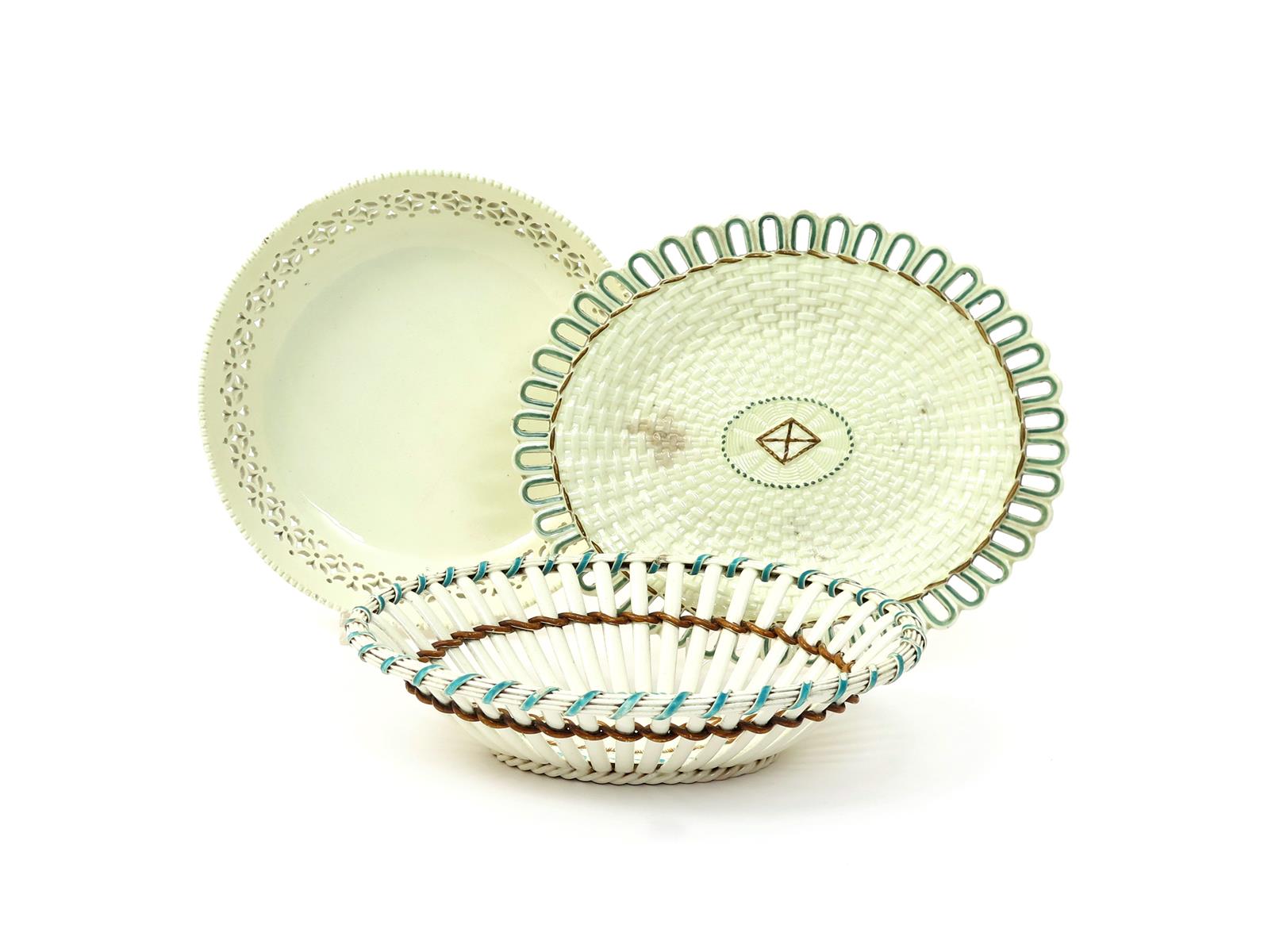 A creamware basket and stand 19th century, of oval form, the slatted basket linked with a brown band and garlanded with turquoise around the rim, and a creamware bowl with a wide pierced border of hearts and leaves, minor faults, 26cm max. (3)