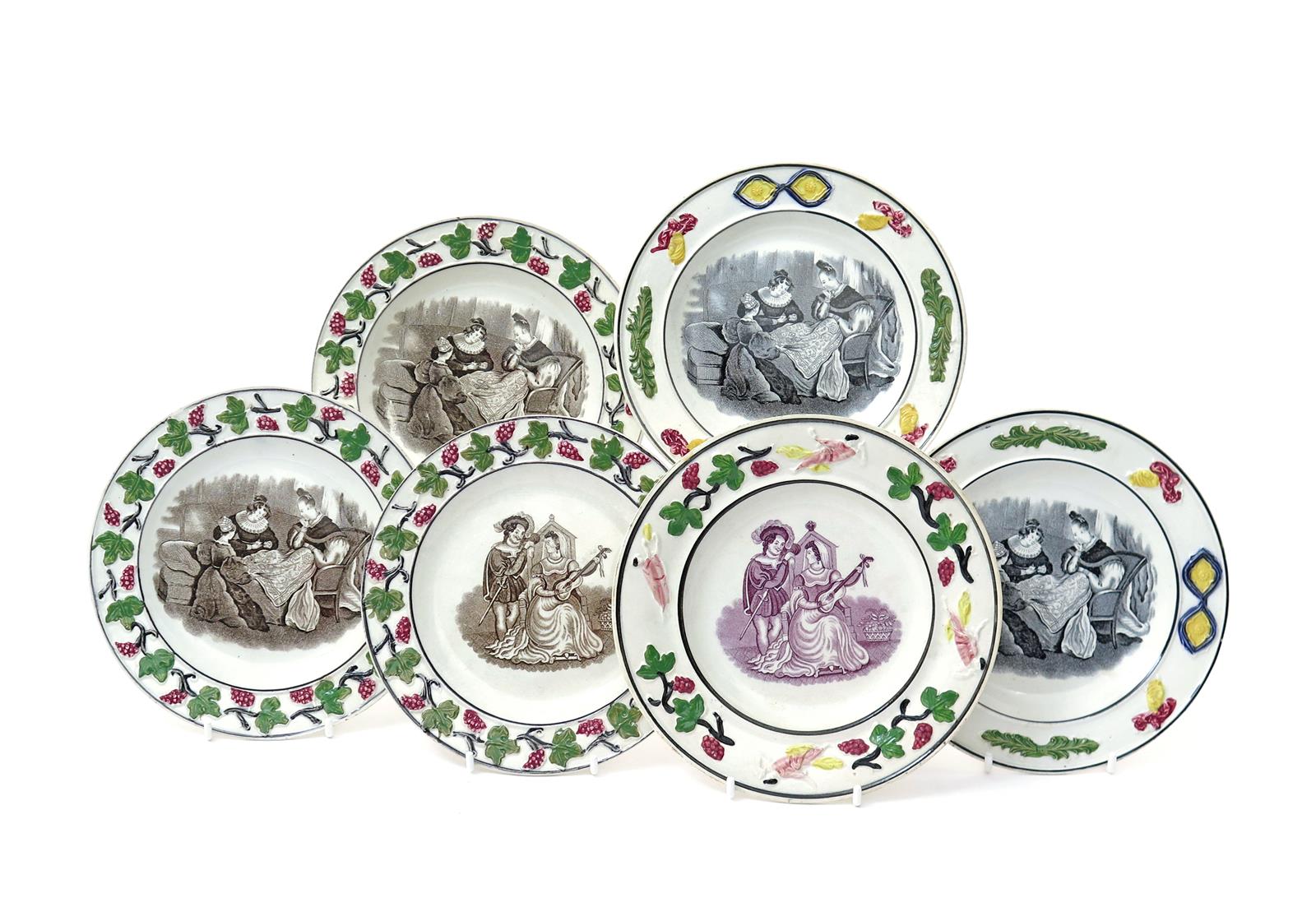 Six Dawson & Co. pearlware nursery plates c.1830, printed with ladies having their fortune told, or with a young Queen Victoria playing to Prince Albert, the rims moulded with grapevine or small motifs and hand coloured, impressed and printed marks, 17.7cm max. (6)