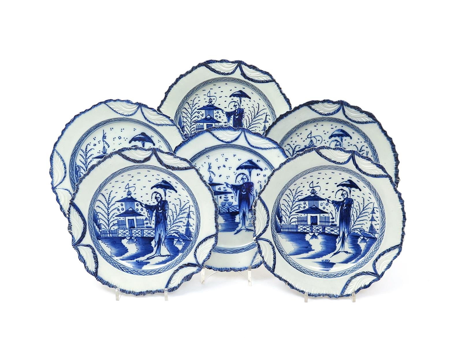 Six Delftfield (Glasgow) pearlware plates c.1800, painted with a tall Chinese figure holding a parasol and standing before a two-storeyed pagoda, the feathered rims with six moulded leaves, incised D marks, 24.3cm.