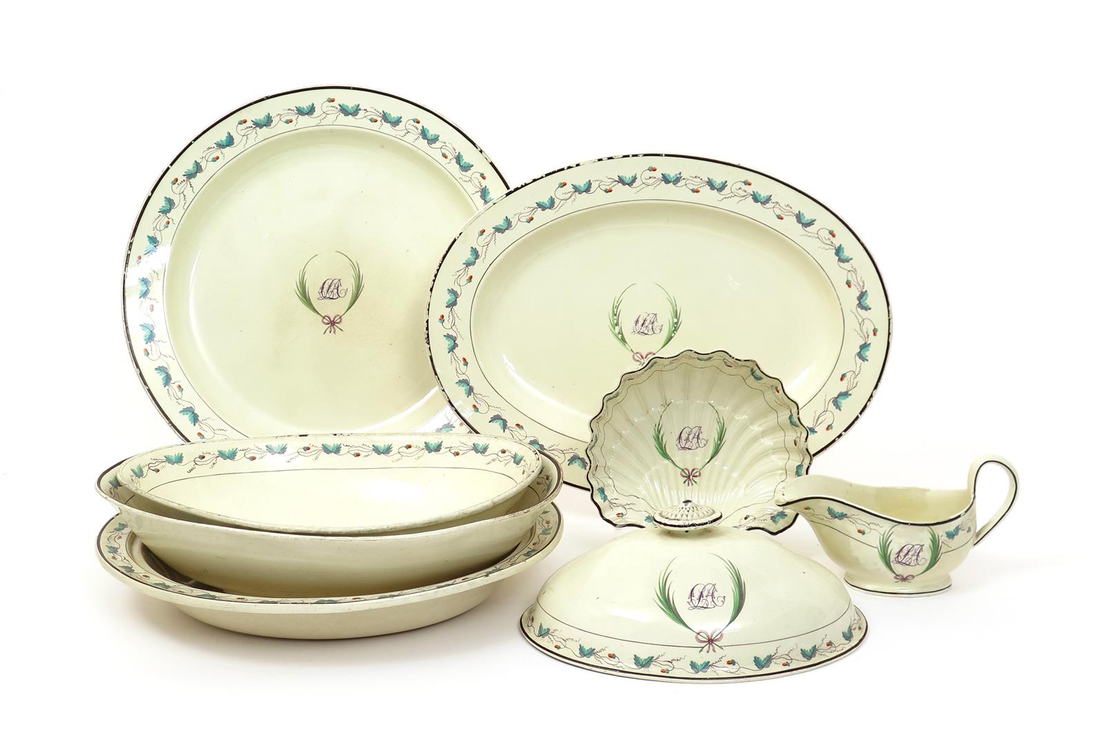 A Leeds creamware part service early 19th century, painted with the monogrammed initials 'CLA' flanked by leaf fronds, the rims with a continuous vine border, impressed marks, some damages. Comprising: a massive circular dish, three oval dishes, two vegetable tureens, two oval bowls, a tureen cover, a sauceboat and a shell dish. (11)