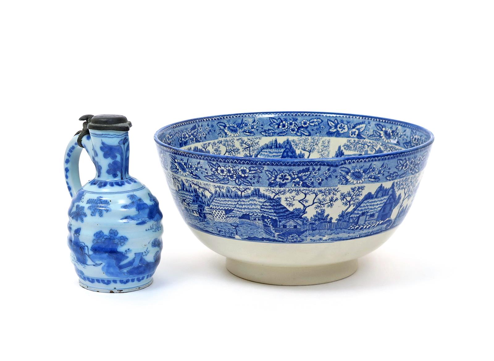 A Frankfurt faïence pewter-mounted jug or ewer early 18th century, moulded with horizontal bands, painted in blue with Chinese figures in a landscape setting, and a Rörstrand pearlware punch bowl, early 19th century, printed in blue to the exterior and interior rim with a continuous scene of livestock before thatched cottages, the interior well with a large bunch of grapes, impressed mark, 34.6cm max. (2)