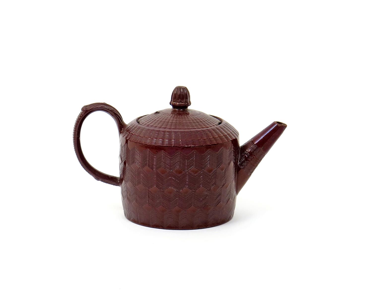 A Staffordshire redware teapot and cover c.1780, the cylindrical body turned with a continuous geometric design, glazed to the interior and exterior, some faults, 17cm. (2)