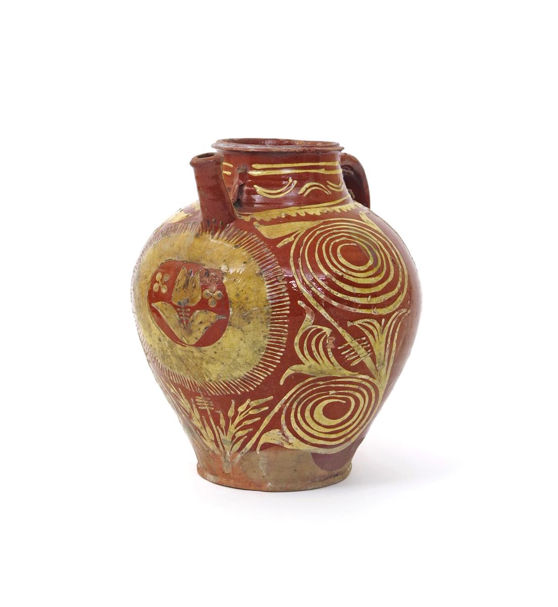 A large slipware jug probably 18th century, the large ovoid body decorated in cream slip with a central tulip roundel beneath a protruding spout, the sides with large swirls, some flaking to the glaze, 30.5cm.