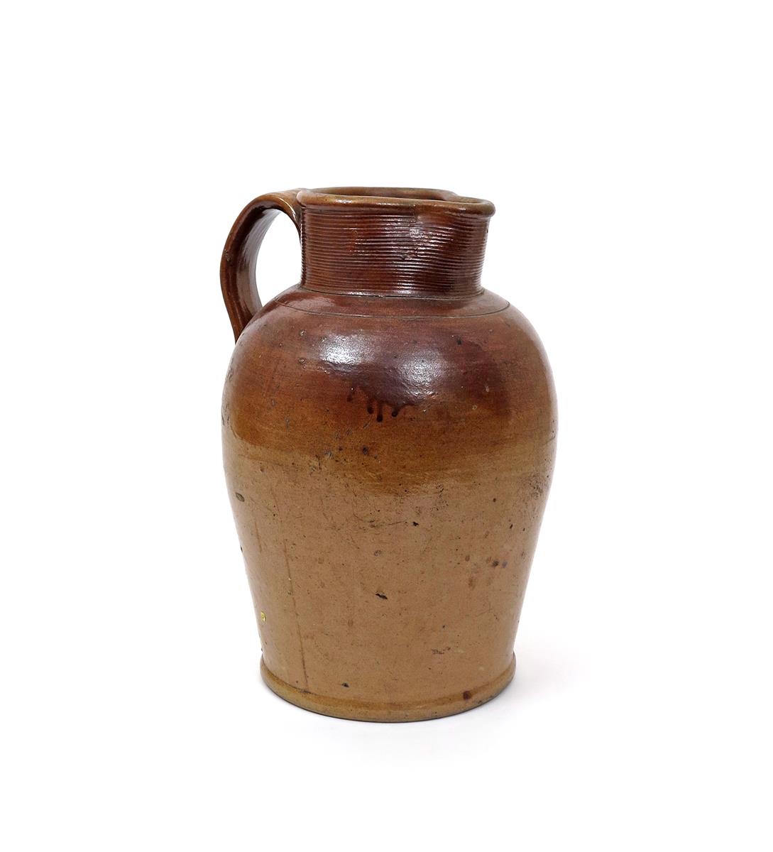 A large brown stoneware jug the generous ovoid body rising to a straight neck and pinched spout...