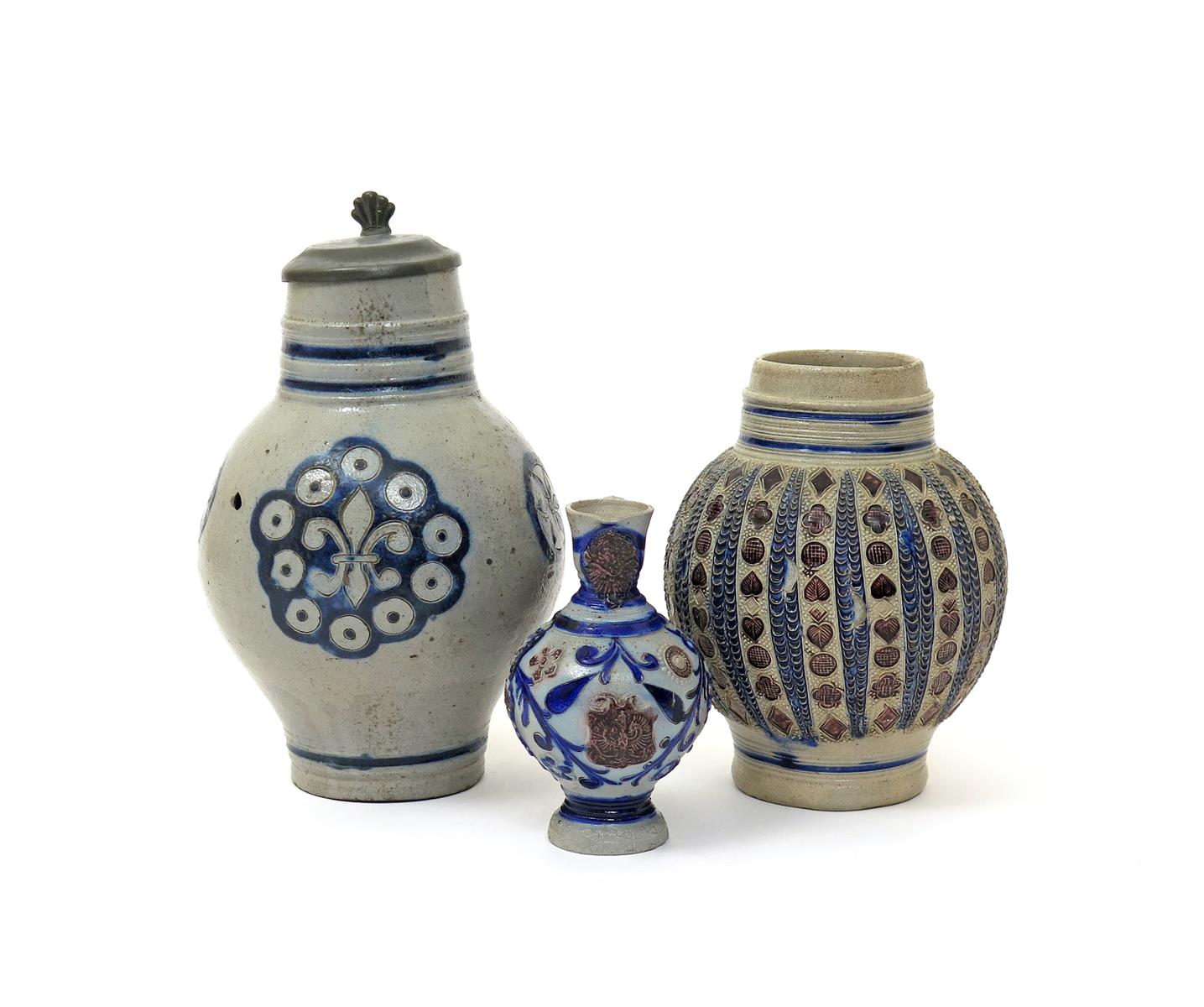 Three Westerwald stoneware jugs 18th century, one with applied and incised decoration of vertical stripes in blue and manganese, one with an incised fleur de lys and a pewter cover, the smallest with an applied eagle amidst flowering branches, one cover lacking, 26.5cm max. (3)