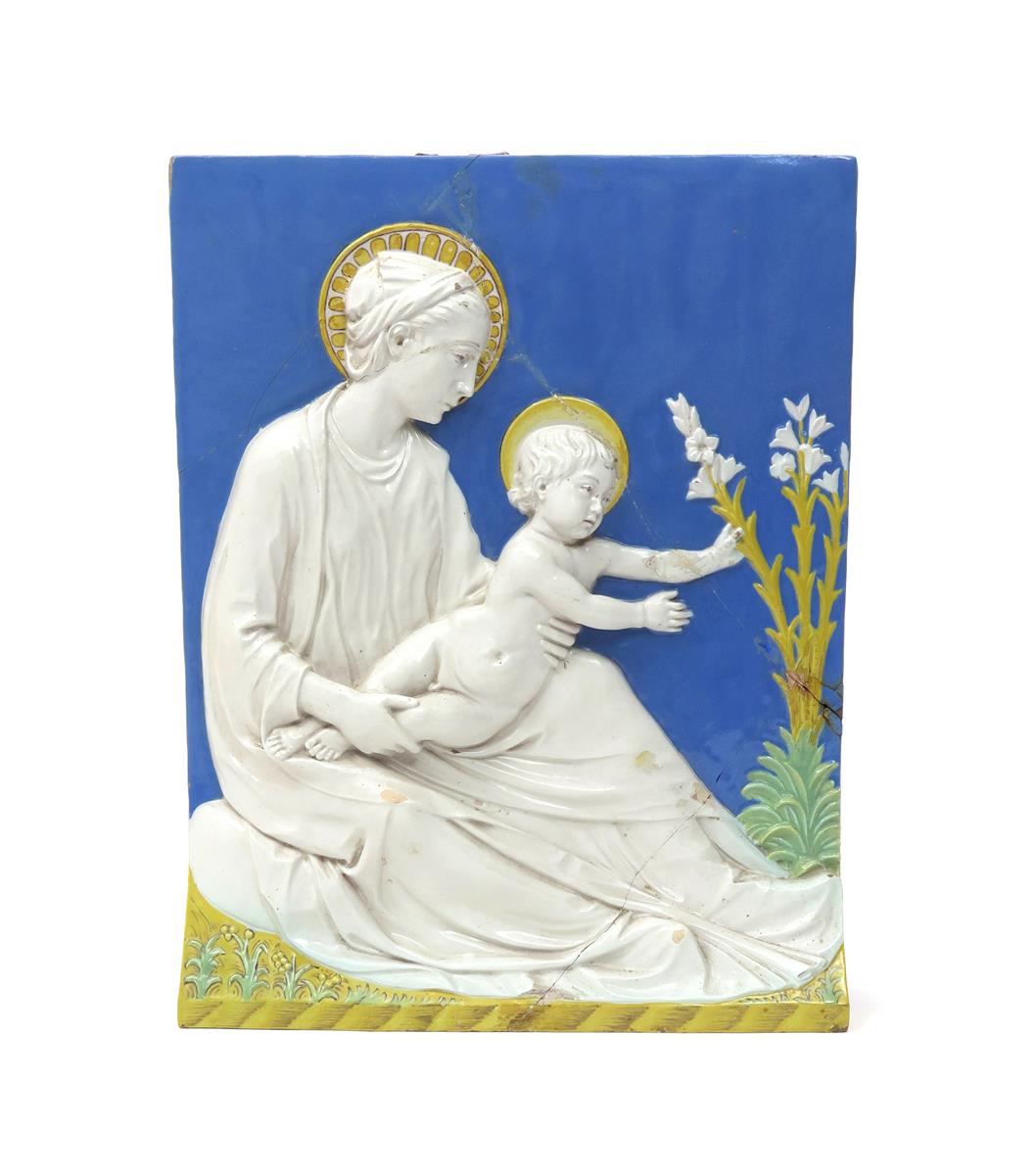 A large Cantagalli maiolica plaque late 19th/early 20th century, the rectangular form modelled in high relief with Mary and the infant Jesus, the baby reaching out to grasp a stem of lilies, picked out in white, yellow and green on a blue ground, damages and repairs, 43.5cm.