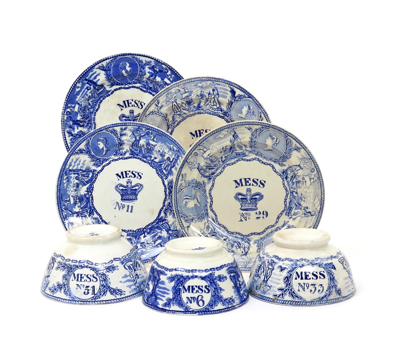 Four transferware Royal Navy Mess plates and three bowls late 19th/early 20th century, printed for Mess numbers 6, 8, 11, 29, 33, 44 and 51, most with portraits of Queen Victoria, one plate and bowl with King Edward, flanked by scenes of sailors waving pennants, various marks, some damages, and repairs, 24cm. (7)