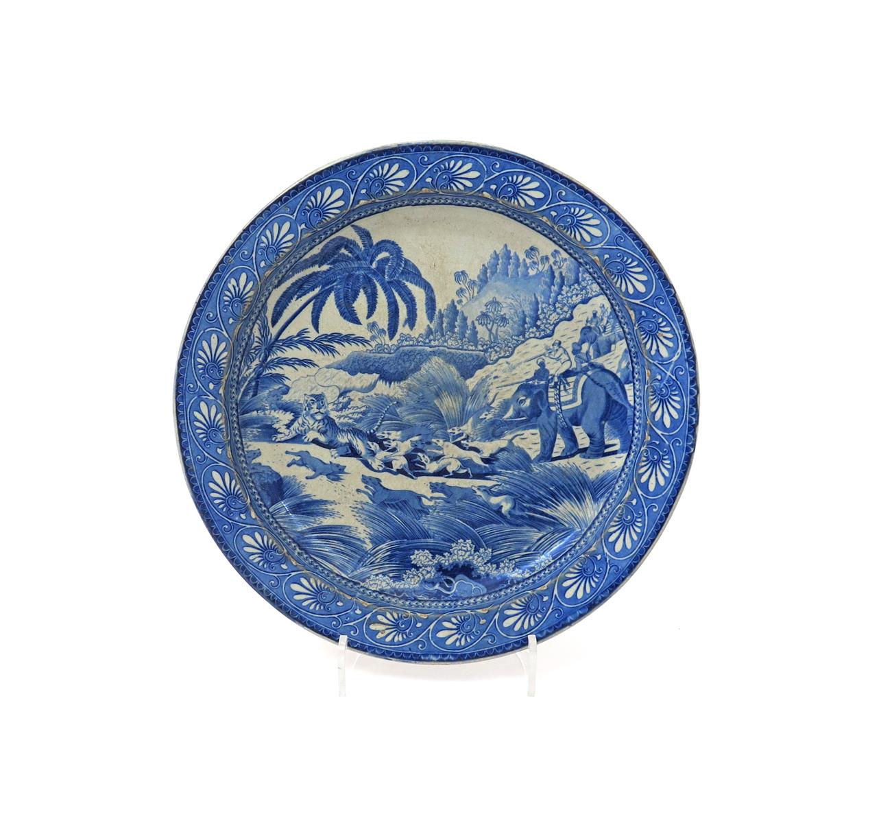 A large blue and white transferware circular dish or stand 1st half 19th century, depicting a tiger hunt, the unfortunate cat being set upon by a pack of hounds, while a figure on the back of an elephant fires his gun, within a scrolling Greek palmette border, some wear, 36.5cm.