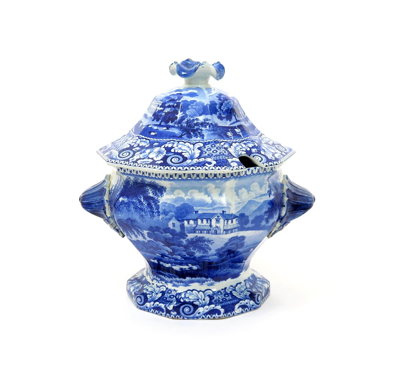 A large blue and white transferware soup tureen and cover 19th century, by John and Richard Riley, the octagonal form printed with a view of Gracefield House in Queen's County, Ireland, after the engraving by Robert Wallis, within a floral and scroll border, printed mark, minor faults, 34cm. (2)