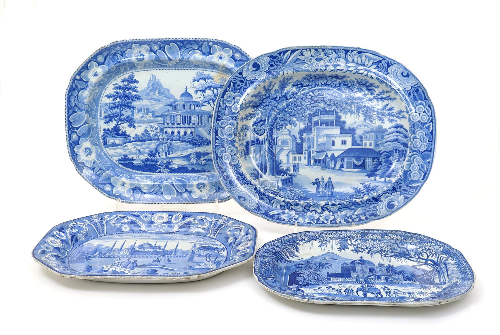 Four blue and white transferware meat dishes 19th century, variously printed with Indian topographical scenes, one with the Mosque of Sultan Achmet, two attributed to Herculaneum and decorated with a view of the Mausoleum of Nawaub Assoph Khan at Rajemahel, and with a View in the Fort Madura, the last attributed to John and Richard Riley and printed with figures before buildings after Thomas and William Daniell's 'Oriental Scenery' volumes, some damages, 52cm max. (4)