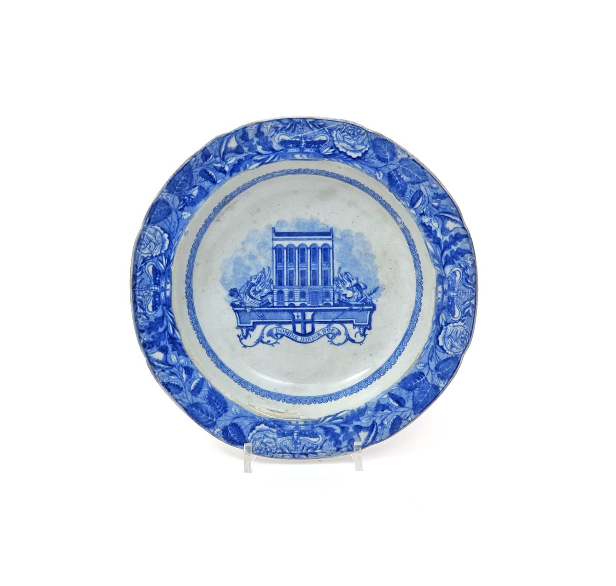 A blue and white transferware soup bowl 19th century, printed with the arms of the City of London, a shield quartered by the cross of St George, containing the sword of St Paul, above a banner titled 'Domine Dirige Nos', the border with crowns and the flowers of the Union, 23.2cm.