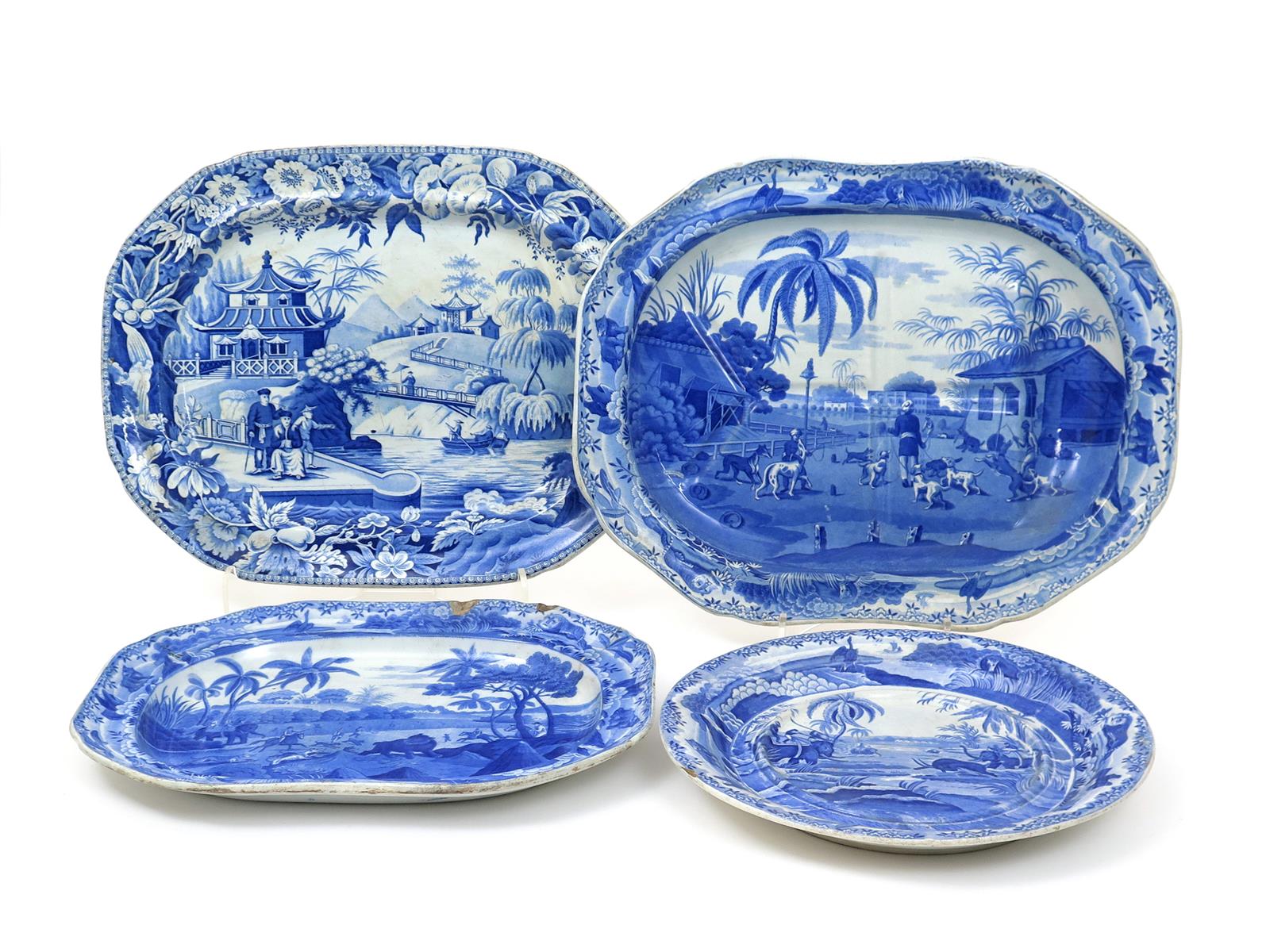 Three Spode blue and white transferware dishes from the Indian Sporting Series 1st half 19th century, one a circular tureen stand and printed with 'Hunting a Buffalo', a charger with 'Driving a Bear out of Sugar Canes', the last a meat dish with 'Dooreahs Leading out the Dogs', together with a Davenport meat dish of Chinese figures seated in a watery pagoda landscape, some faults, 47.8cm max. (4)
