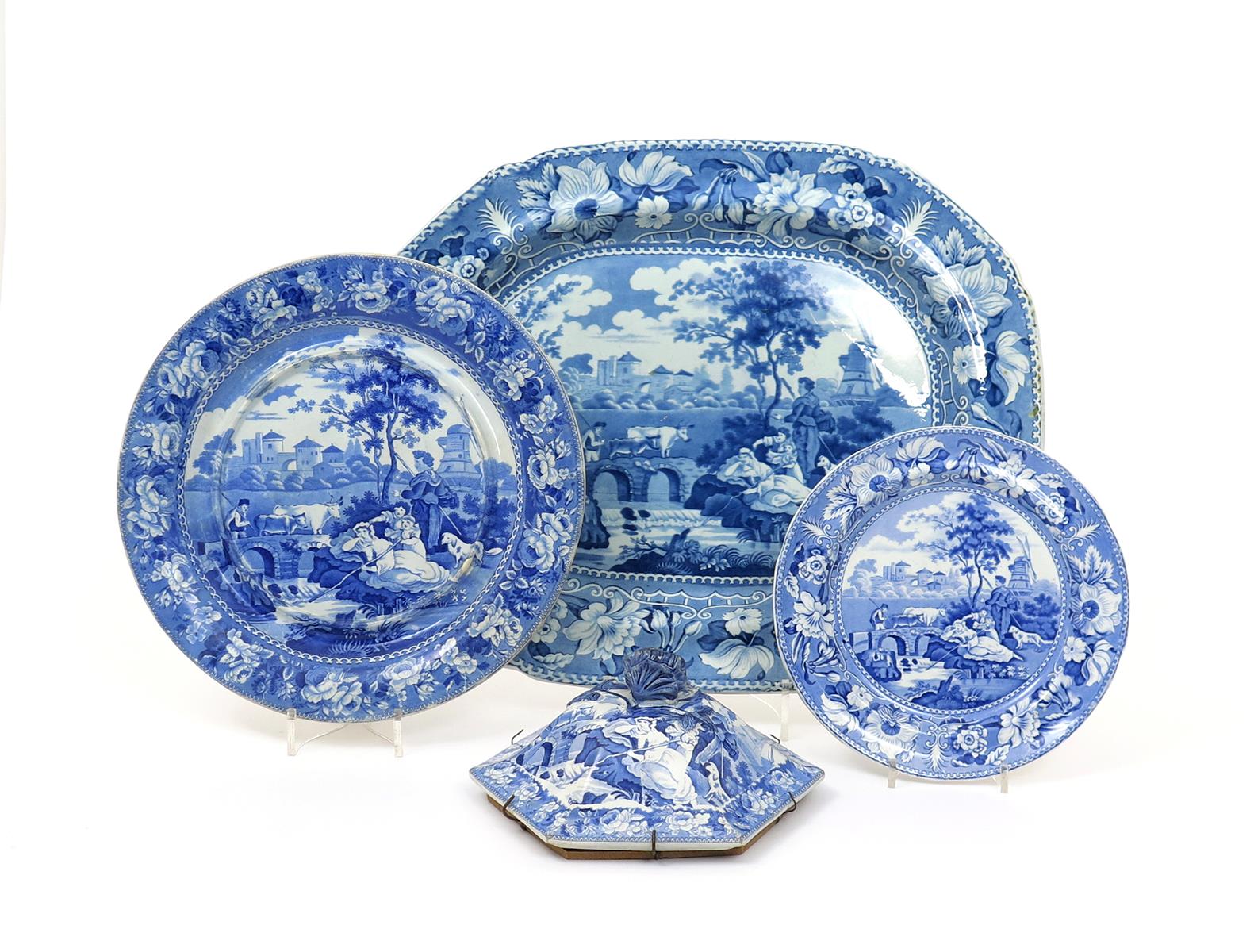 Three blue and white transferware dishes and a cover 19th century, including a plate, a tureen stand and a meat dish, all printed with a maiden sleeping beside a river, being teased by two children while a further figure drives cattle over a bridge, a windmill and other buildings beyond, the rim with a continuous flower garland, 51cm max. (4)