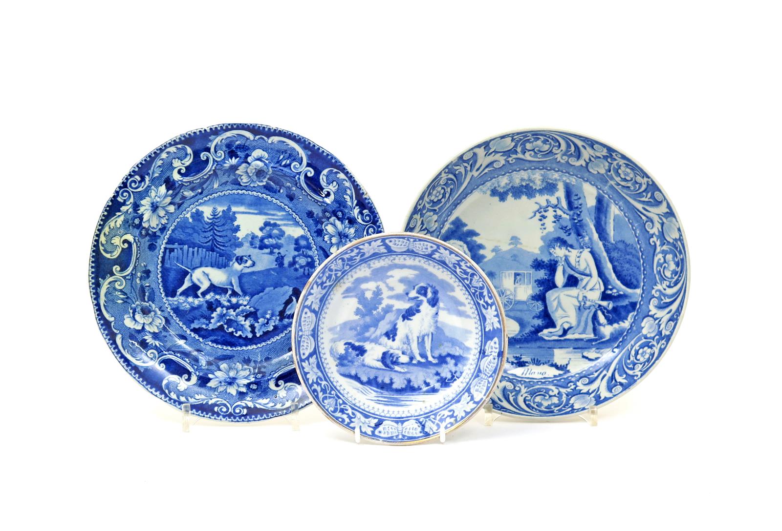 A rare Mason's Semi China transferware plate c.1825, printed with a young maiden seated beneath a tree and resting her head on one hand, a figure in a coach visible behind, titled Maria, with an Enoch Wood & Sons plate of a terrier flushing out a game bird, and a saucer printed with two spaniels, some faults, 21.5cm max. (3)