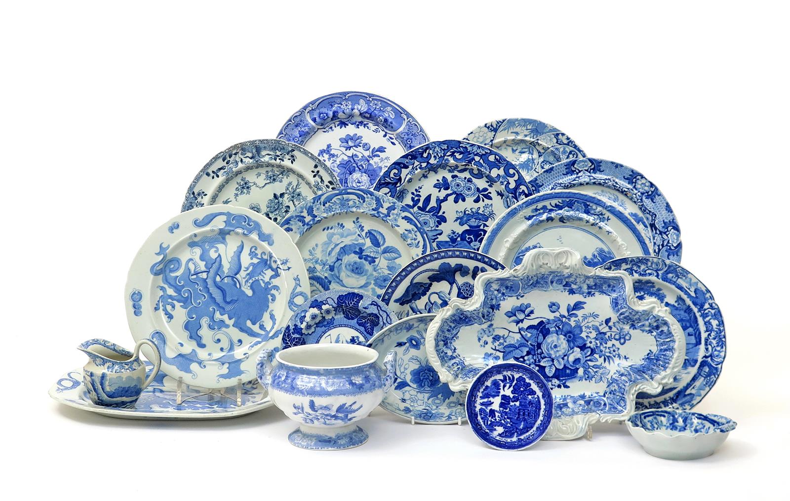 A collection of blue and white transferware 19th century, including pearlware and stone china, most Mason's Ironstone and variously decorated with blown roses, the Blank Bridge pattern, the Table and Vase pattern, the Opium Smoker, and the Blue Dragon. Comprising: a tureen, a milk jug, two tureen stands, a moulded dessert dish, a pickle dish, and twelve plates in various sizes. (18)