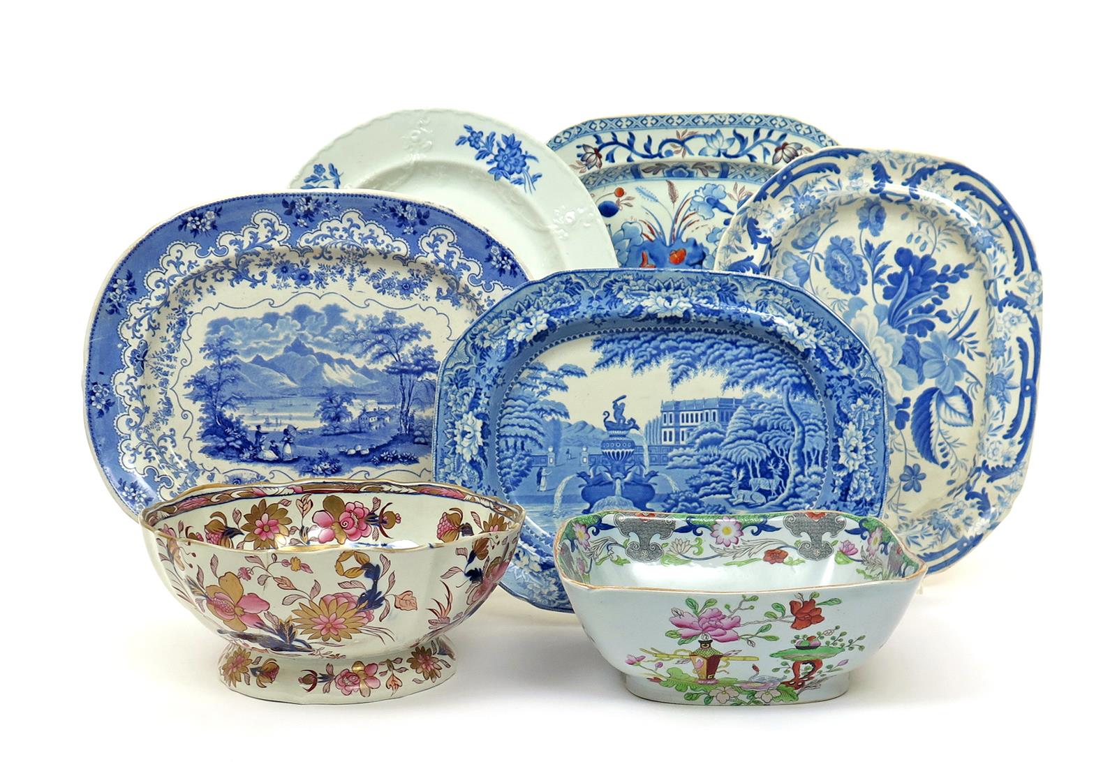 Five blue and white printed Ironstone meat dishes 19th century, one printed with the Fountain pattern, one with roses, one with peony and an Oriental fence, with later red enamelling, one with a view of Lake Windermere, the last with small flower sprigs within a moulded rim, and two large bowls decorated in polychrome enamels with vases and sprays of Oriental flowers, some damages, 41cm max. (7)