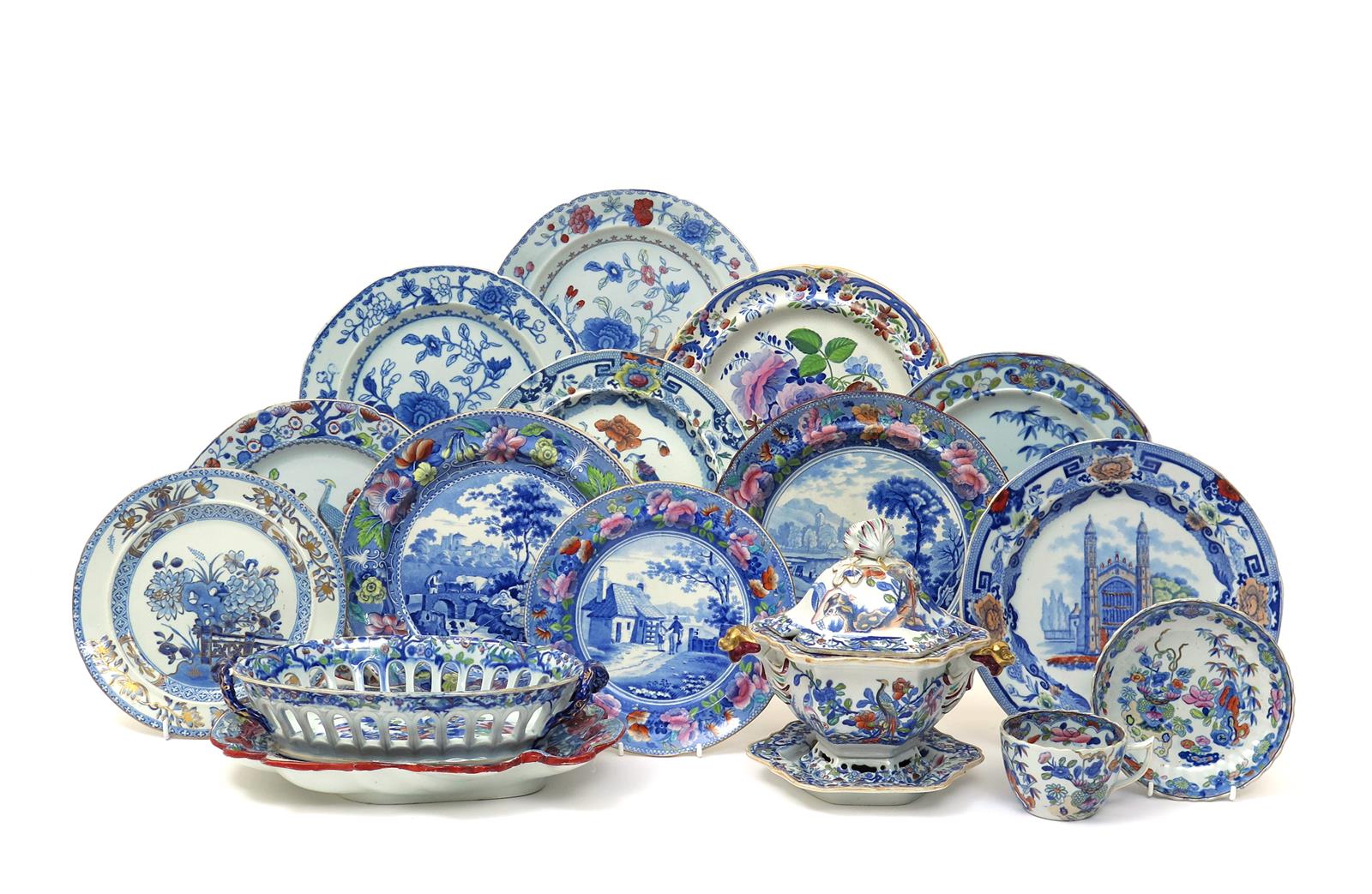 A collection of Mason's Ironstone printed and clobbered wares 19th century, including a sauce tureen with cover and stand decorated with the Long-Tailed Bird pattern, with gilt bat handles, an oval basket in the same pattern, a moulded dish in the Tyburn Turnpike pattern, a cup and saucer, and eleven plates variously decorated in patterns including the Crossed Fence, the Tyburn Turnpike, the Long-Tailed bird, the Indian Grasshopper, the Blue Pheasant, the Windmill, Linlithgow Palace, Bamboo, and one of King's College, titled for 'James Lawrence' to the underside, some faults, 29cm max. (18)