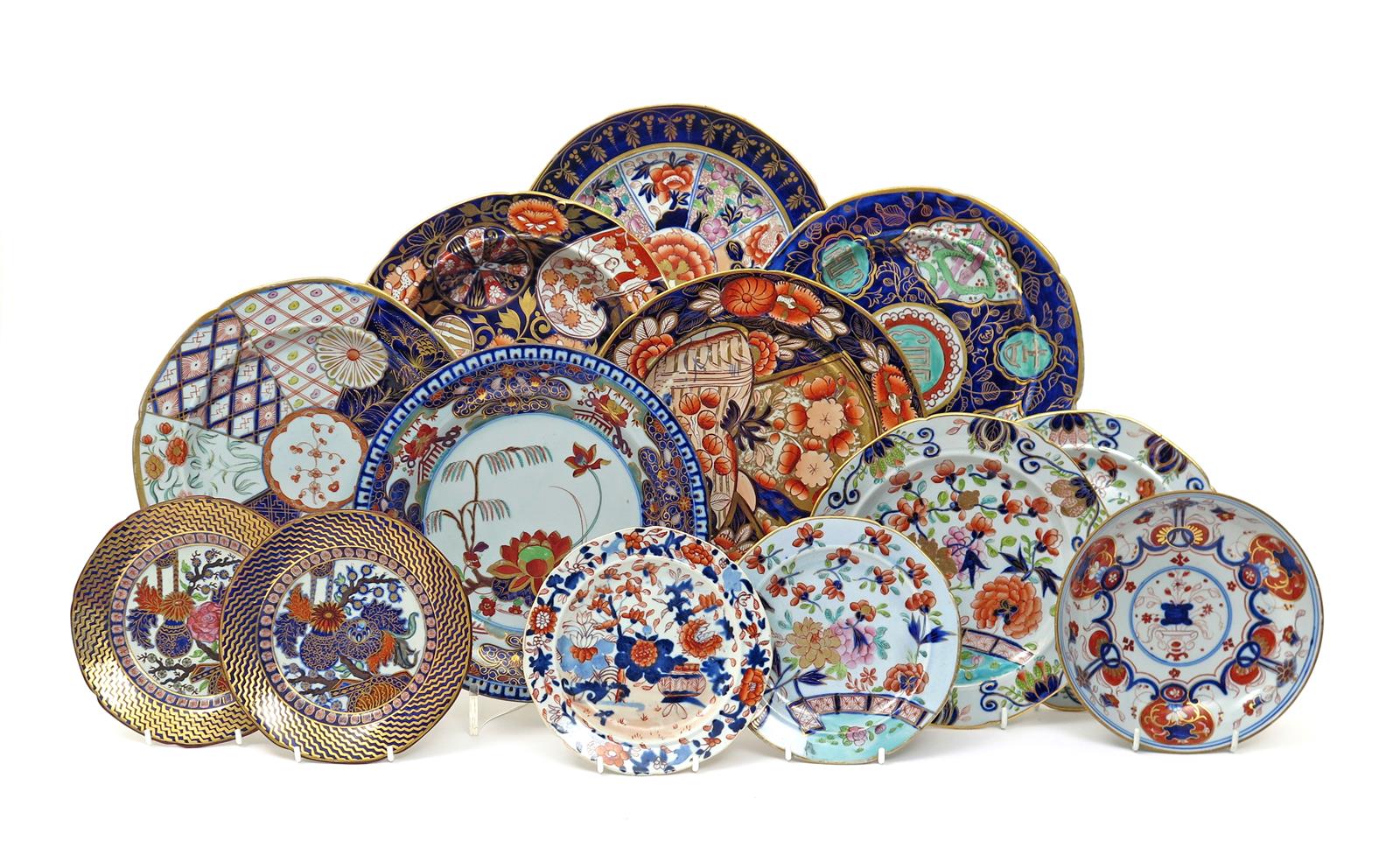 Twelve Ironstone plates 19th century, all variously decorated in the Japanese manner, including a Turner & Co saucer dish with a rare square seal mark, a pair of Turner's Patent small plates in pattern 8, and a matching larger plate, two small Mason's Ironstone plates and two larger, a soup plate in the Fiddle Head pattern, a plate in the Dollar pattern, one in the Old School House pattern, and another in the Segmented Imari pattern, 24cm max. (13)