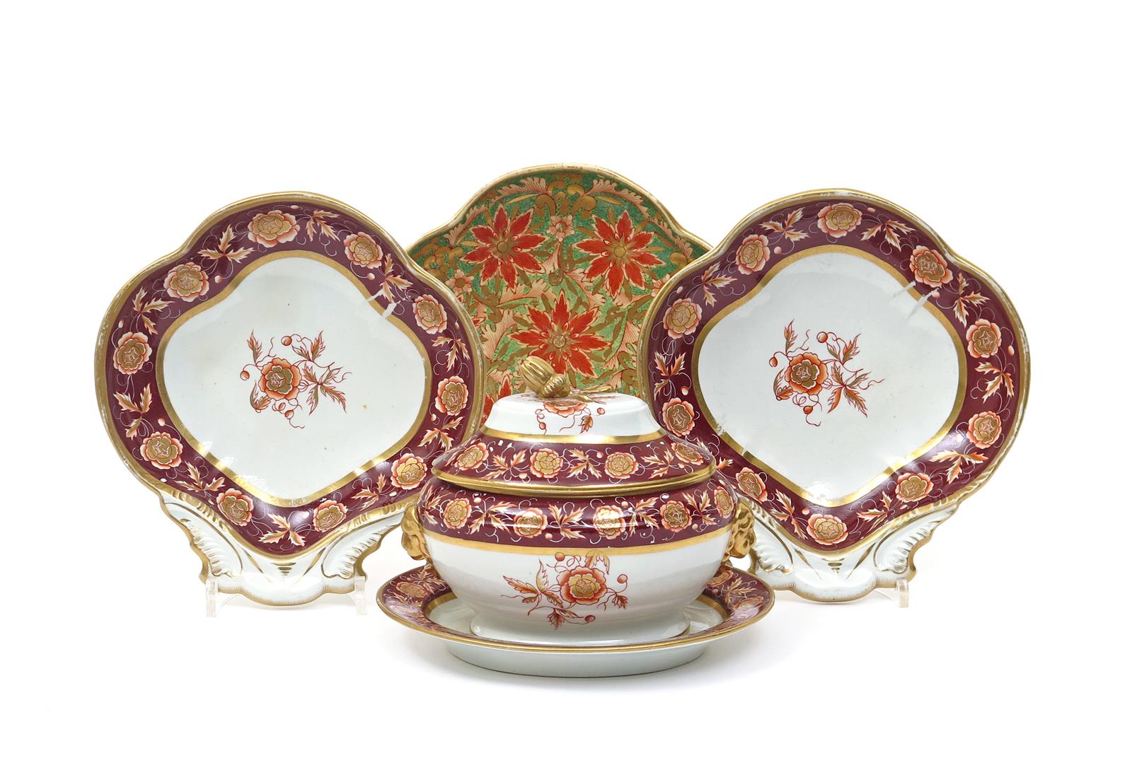 A Mason's Ironstone part dessert service 19th century, decorated with a continuous band of orange and gilt flowers reserved on a burgundy border, impressed marks. Comprising: a sauce tureen with cover and stand, two shell-shaped dishes, and a Miles Mason dessert dish in pattern 128. (6)