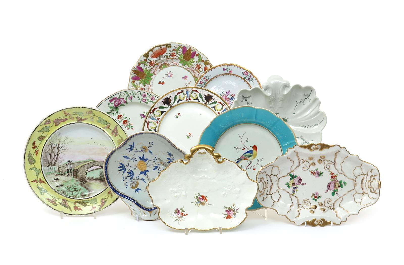 Ten various ironstone plates and dishes 19th century, a moulded dish in the Green Rose pattern, another in pattern 970, a shell-shaped dish decorated with birds on flowering branches, a small Spode plate with flowers, the others variously decorated with a bird, pattern 665, flowers, Classical urns, and a figure walking across a bridge within a yellow border, printed mark for New York export, some damages, 27.5cm max. (10)