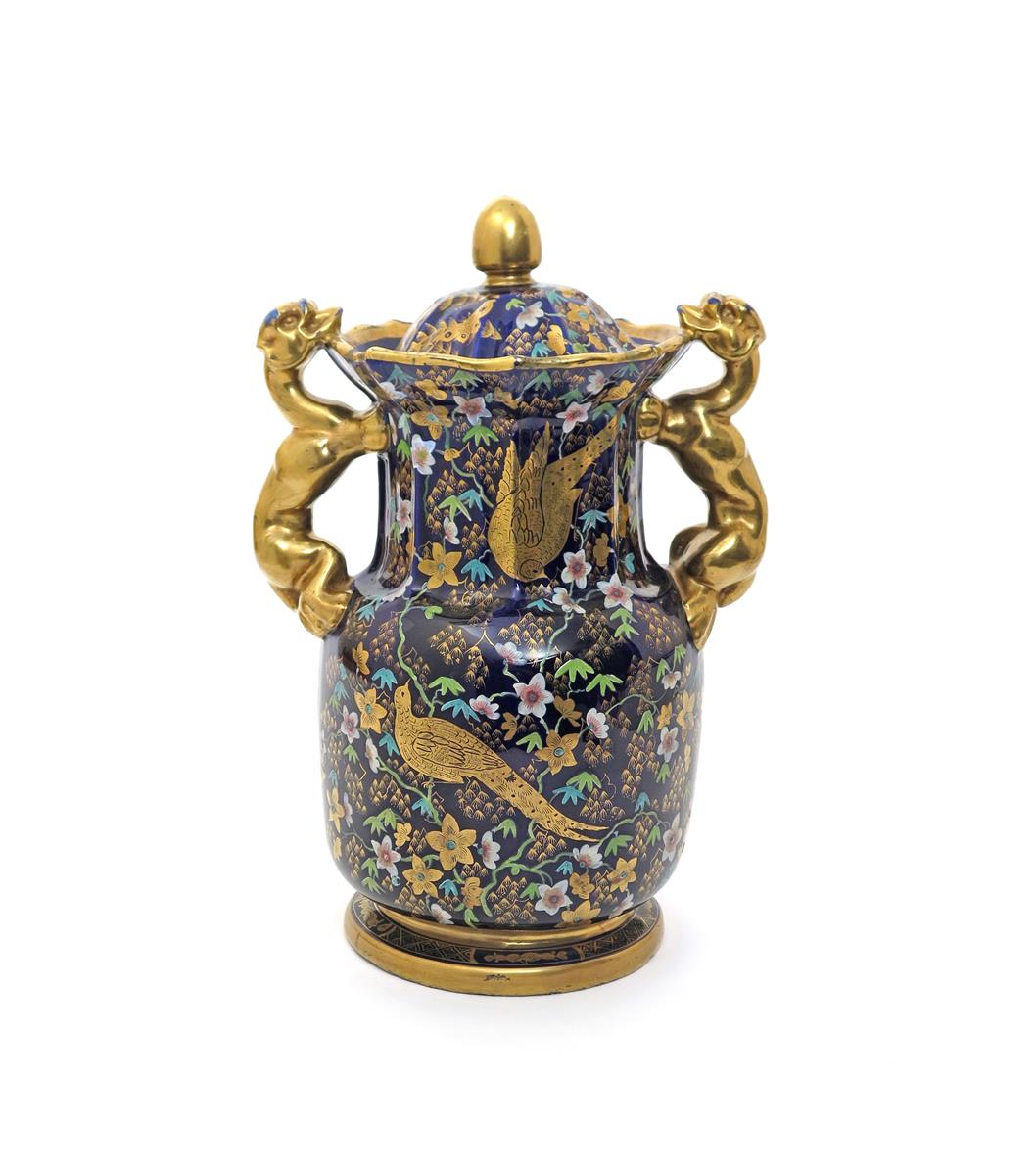 A large C J Mason Ironstone vase and cover c.1830, the moulded form gilded with long-tailed pheasants amidst gilt and enamelled flowers and foliage, reserved on a mazarin blue ground, the handles formed as mythical beasts biting the rim, some good restoration to the rim, 48cm. (2)