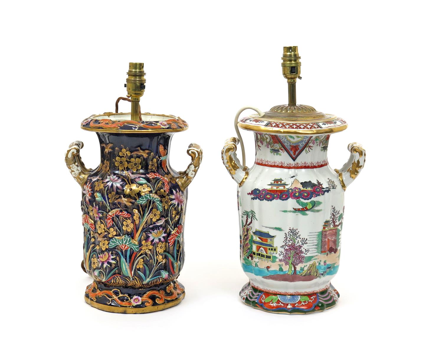 Two Mason's two-handled vases 19th century, mounted as lamps, one printed and coloured with a Chinese pagoda landscape to one side, the reverse with aquatic birds swimming beneath tall lotus plants, the other with moulded and applied decoration of birds, butterflies and flowers reserved on a mazarin blue ground with further gilded flower stems, some faults, 39cm overall. (2)