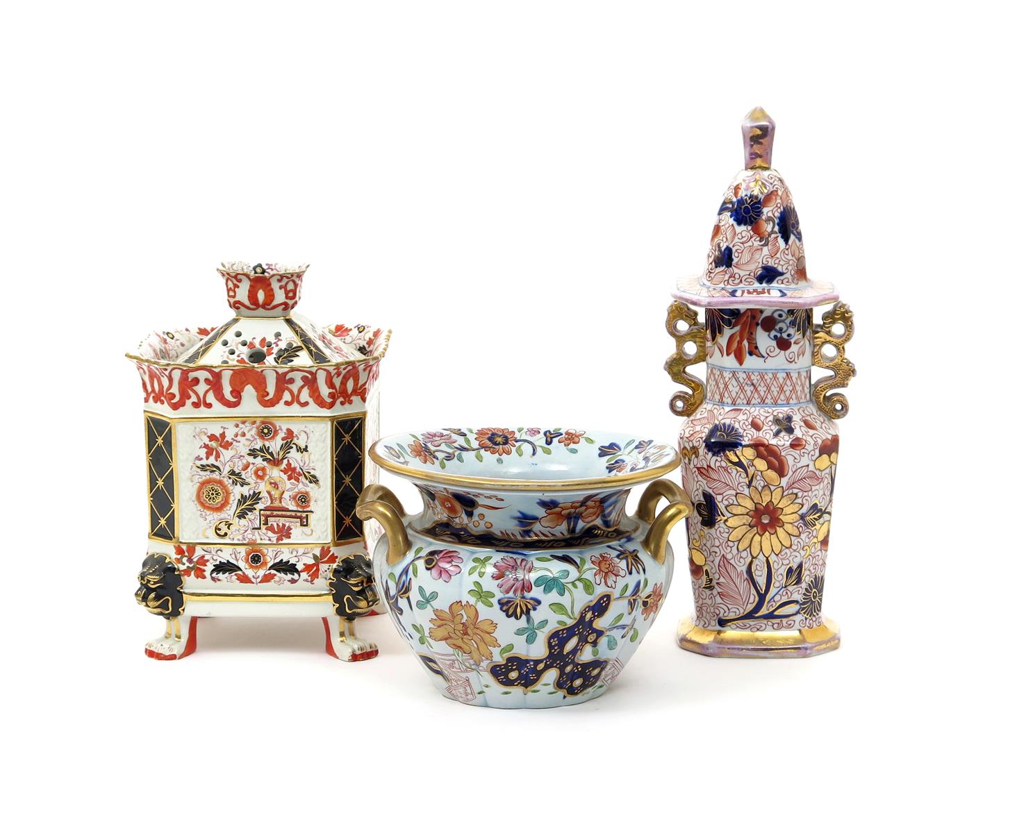 A Mason's Ironstone pot pourri vase with inner and outer covers 19th century, of chamfered square form, raised on four paw feet issuing from lion masks, painted in the Imari palette with vases of flowers on low tables, a tall octagonal vase and cover painted with Imari flowers, and a censer-shaped jardinière decorated with peony and other flowers issuing from holey rockwork, 29.5cm max. (6)