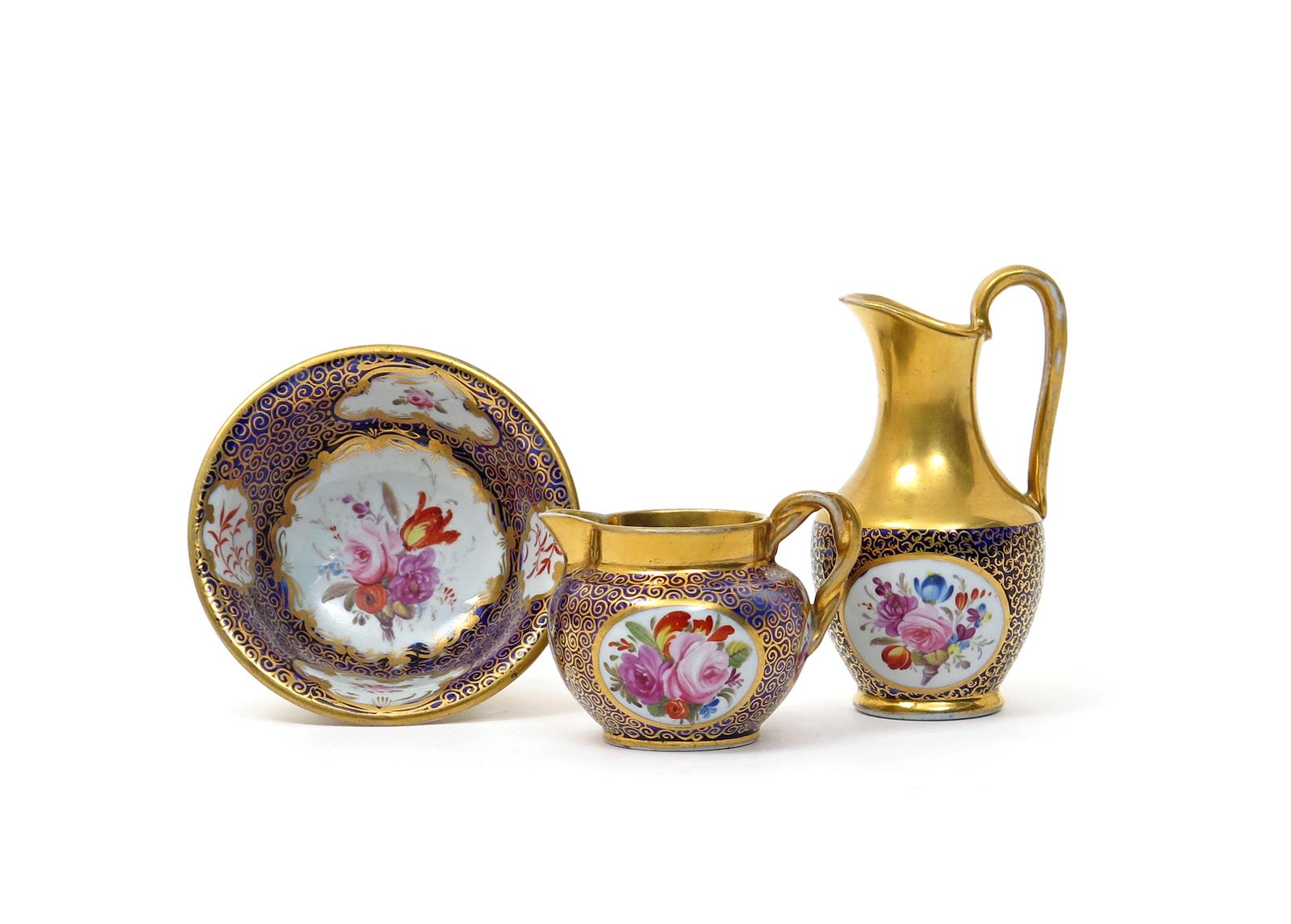 A rare C J Mason's Ironstone miniature jug and basin c.1820, and a miniature ewer, all painted with panels of polychrome flowers reserved on a blue ground with dense gilt scrolls, the bowl and ewer with printed coat of arms marks, 9.2cm max. (3)