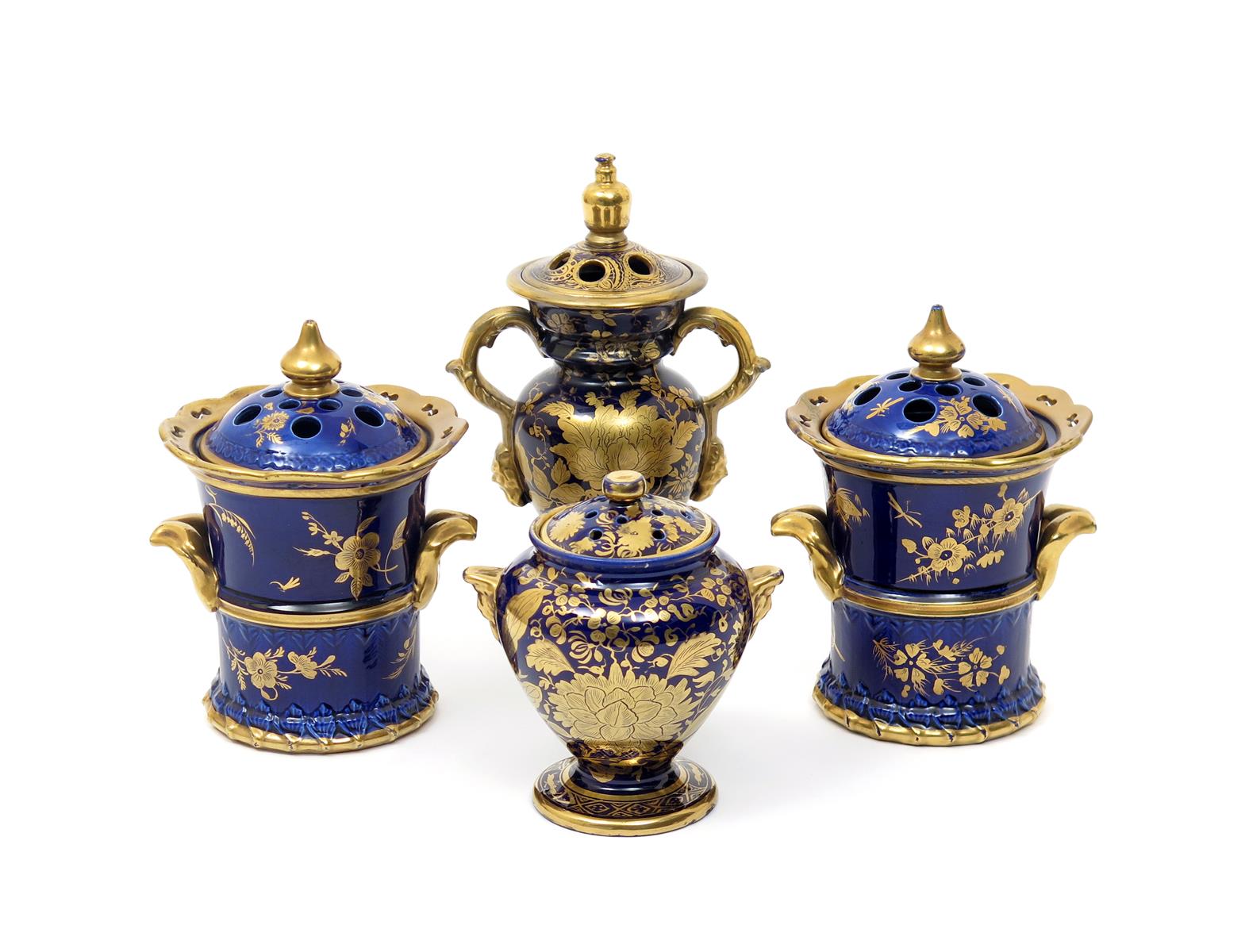 A pair of Mason's Ironstone pot pourri vases and covers 19th century, the flared cylindrical forms decorated with gilt flower sprays on a blue ground, the domed covers pierced with large holes, and two other Mason's pot pourri vases richly gilded with peony sprays on a mazarin blue ground, some restoration, 23.5cm max. (8)
