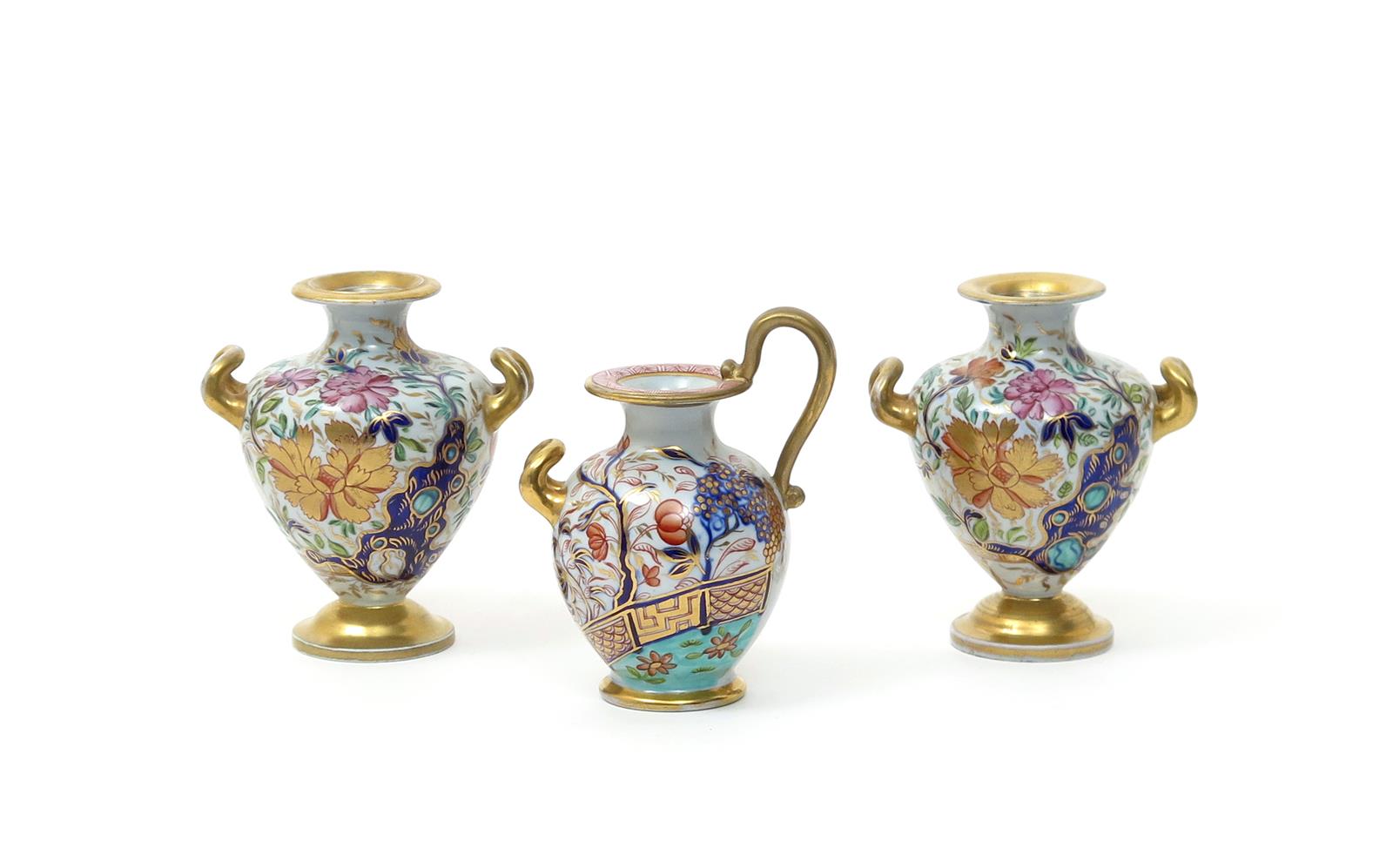 A pair of C J Mason Ironstone two-handled vases c.1820, the ovoid bodies painted in the Oriental manner with flowering branches issuing from holey rockwork, and a miniature ewer with high handle, decorated in the Imari palette with oriental plants behind an ornamental fence, some restoration, 11cm max. (3)