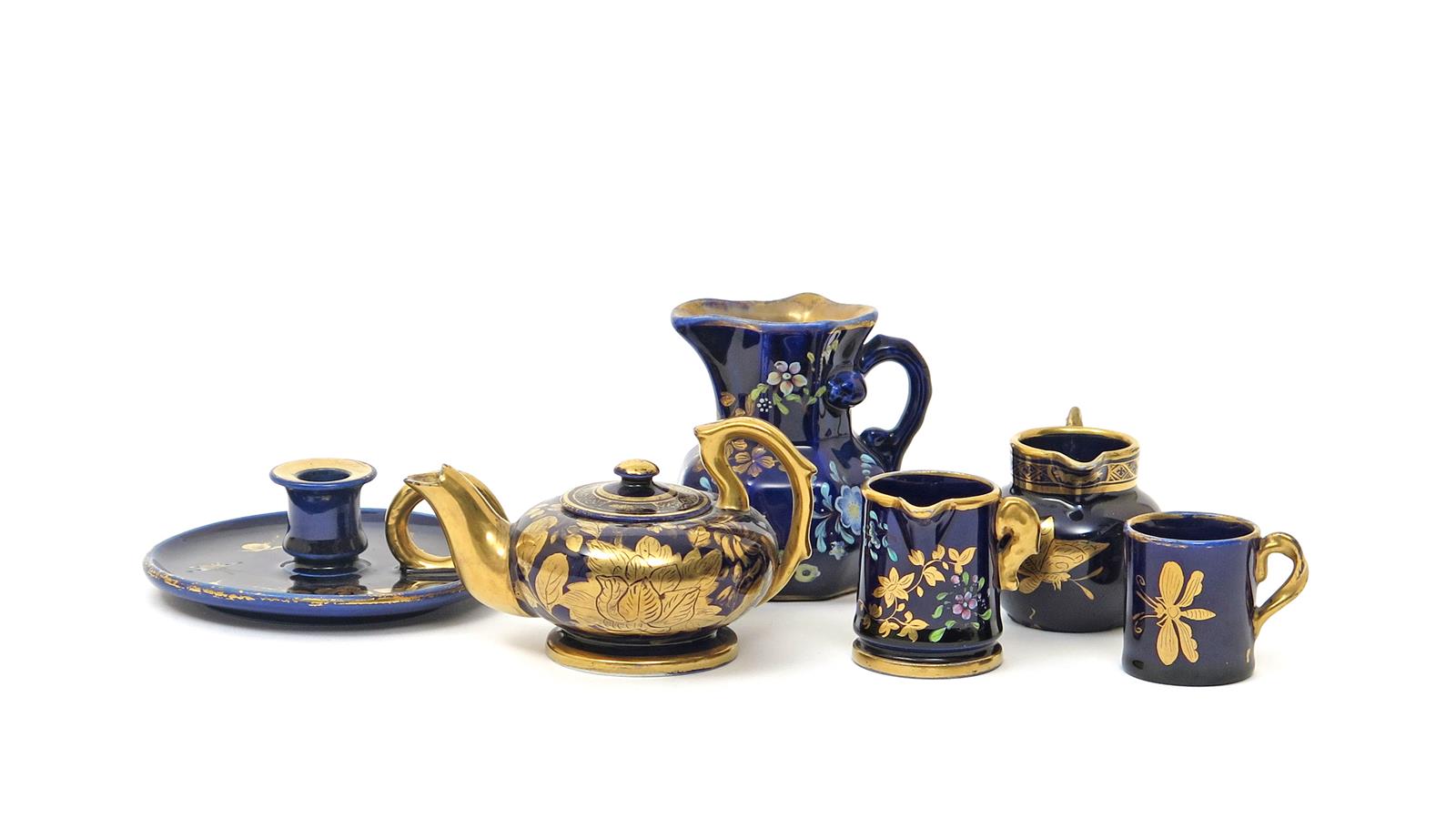 A small collection of miniature C J Mason Ironstone wares c.1820-30, including a teapot and cover decorated with gilt flowers, an octagonal jug and a side-handled jug gilded and enamelled with flowers, a globular jug, a mug and a taperstick gilded with insects and flowers, all reserved on a rich mazarin blue ground, minor faults, 10.5cm max. (7)
