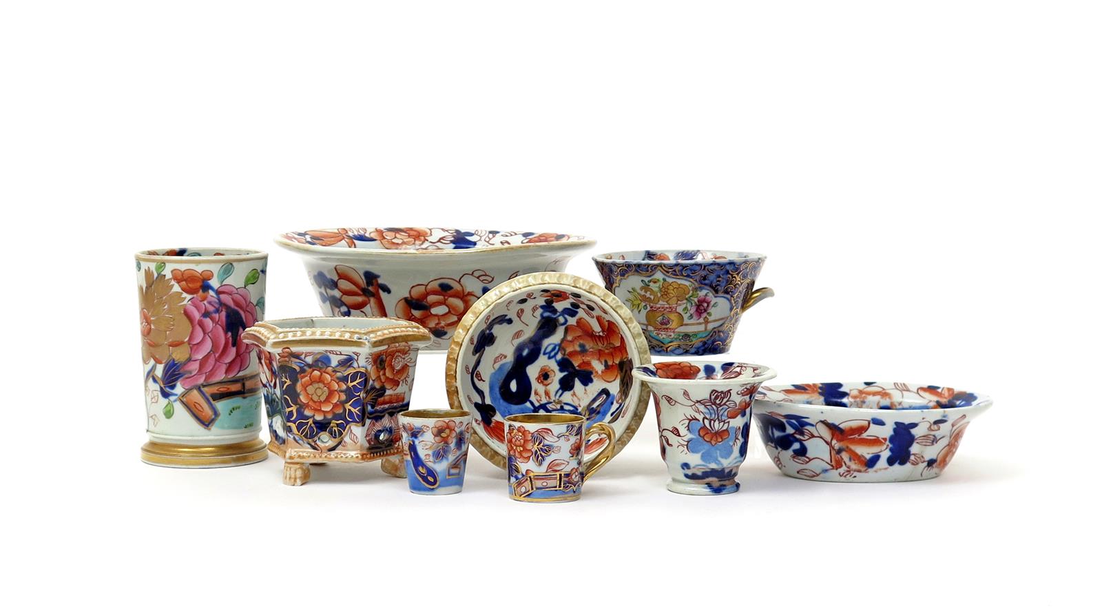 Nine items of Mason's Ironstone 19th century, all decorated in the Imari palette with flowers and the 'Basket Japan' pattern, including a miniature mug, a miniature beaker, an egg cup, a miniature basin, two oval basins or patty pans, a spill vase, a hexagonal pot, and a two-handled pot with blue scale decoration to the exterior, some faults, 16cm max. (9)