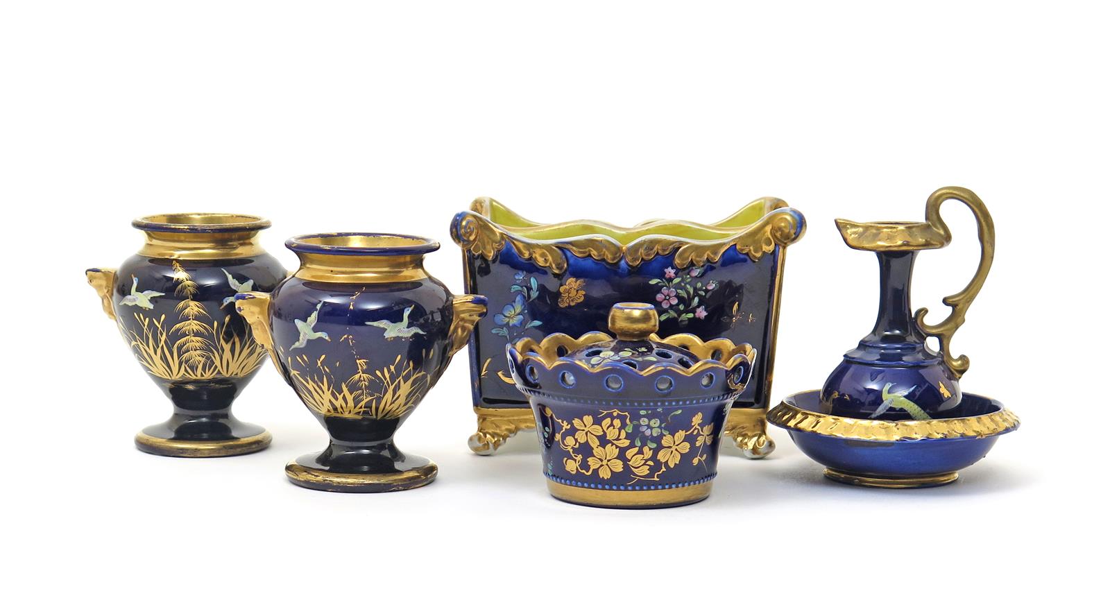 A C J Mason Ironstone letter rack c.1825, and a miniature pot pourri pot and cover, enamelled with small flower sprigs on a mazarin blue ground, together with a pair of miniature vases and a miniature ewer and basin, enamelled with birds in flight amidst gilt foliage, some damages and restoration, 13.5cm max. (7)