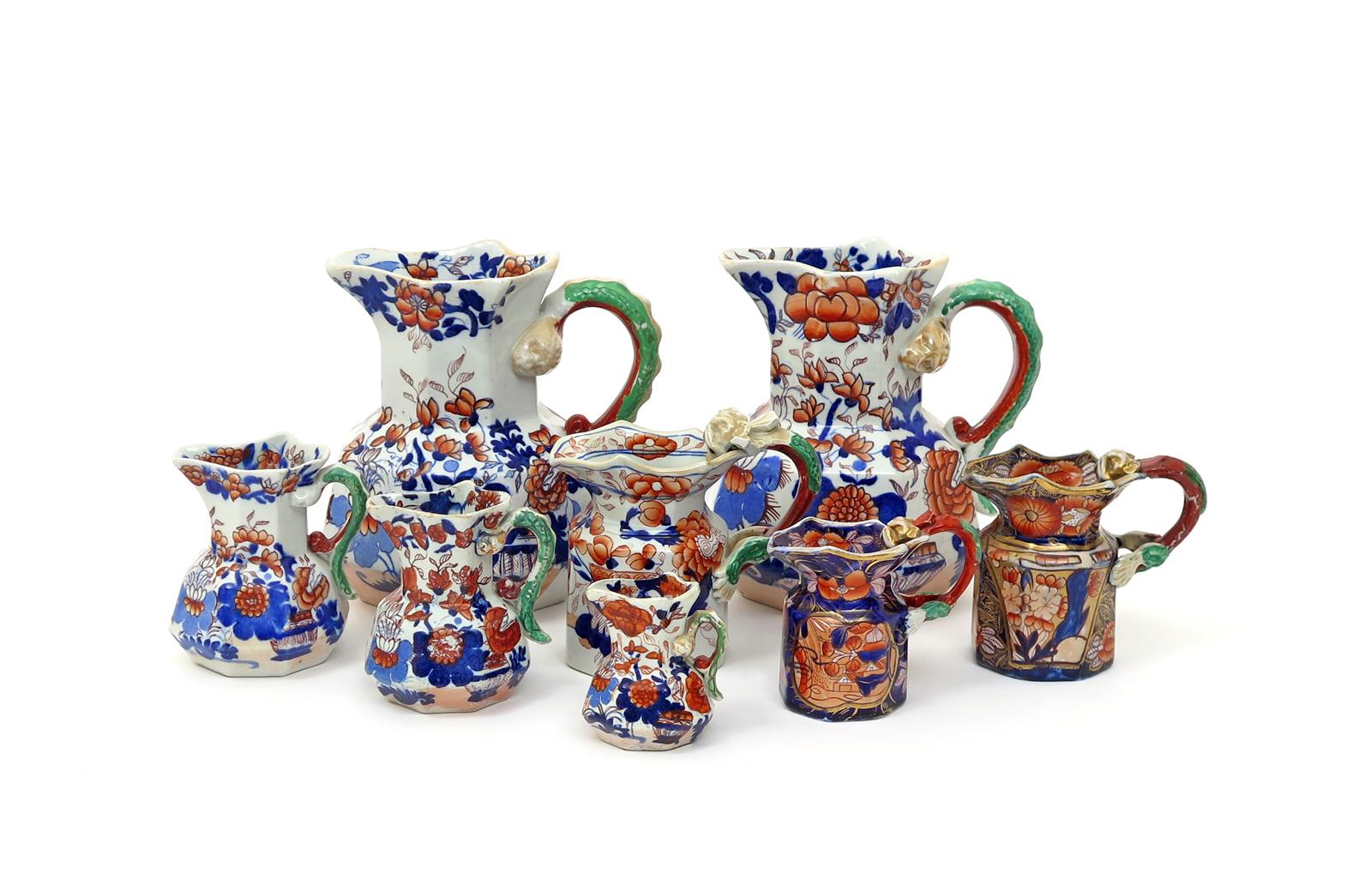 Eight Mason's Ironstone jugs 19th century, of varying octagonal form with kylin handles, decorated in the Imari palette with vases of peony and other flowers, some with printed or impressed marks, some restoration, 19cm max. (8)
