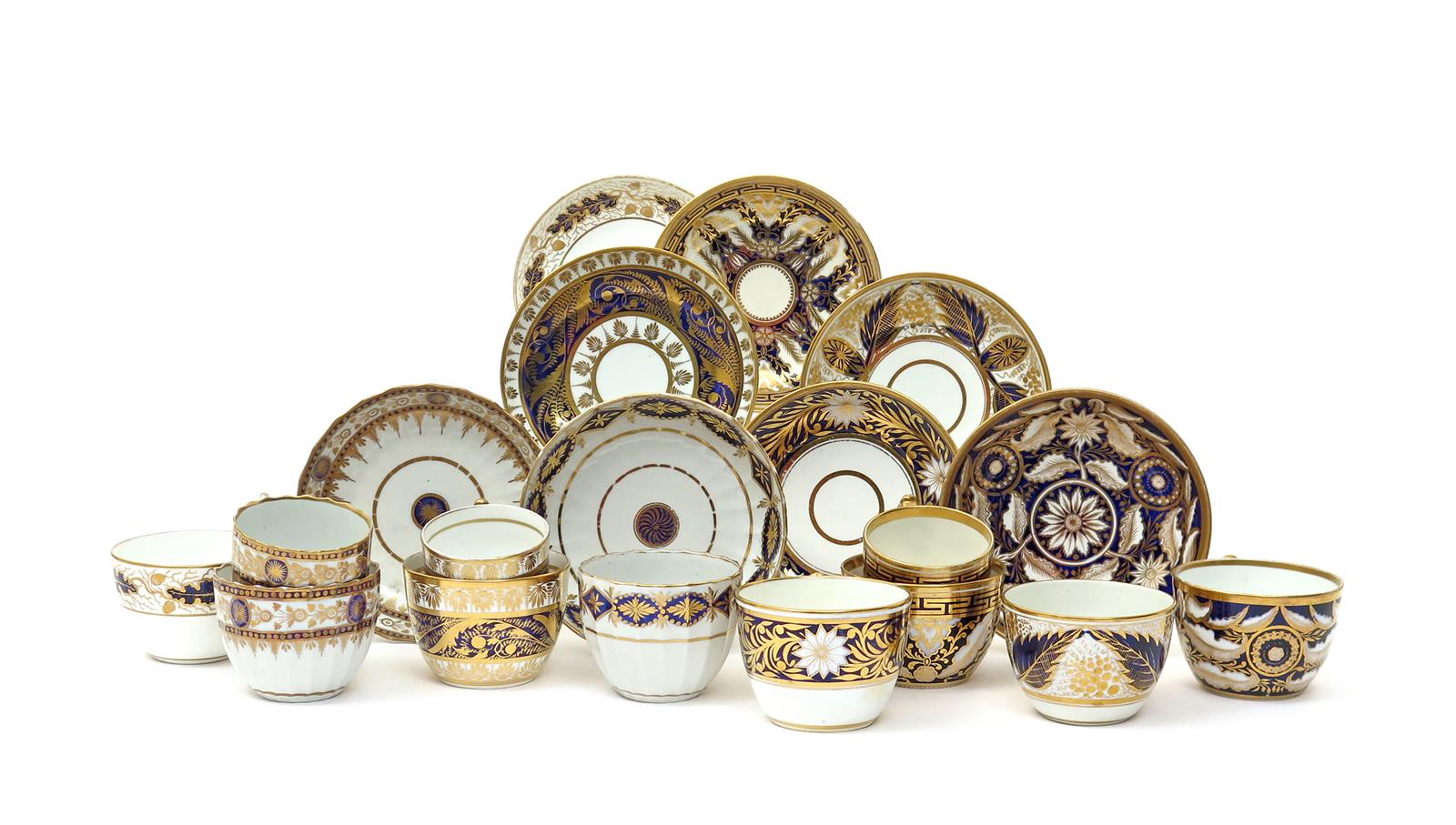 Three Miles Mason porcelain trios and five cups and saucers c.1800-1805, variously decorated in deep blue and gilt with patterns 770, 227, 343, 345, and 371, three with unknown patterns, 14.2cm. (19)