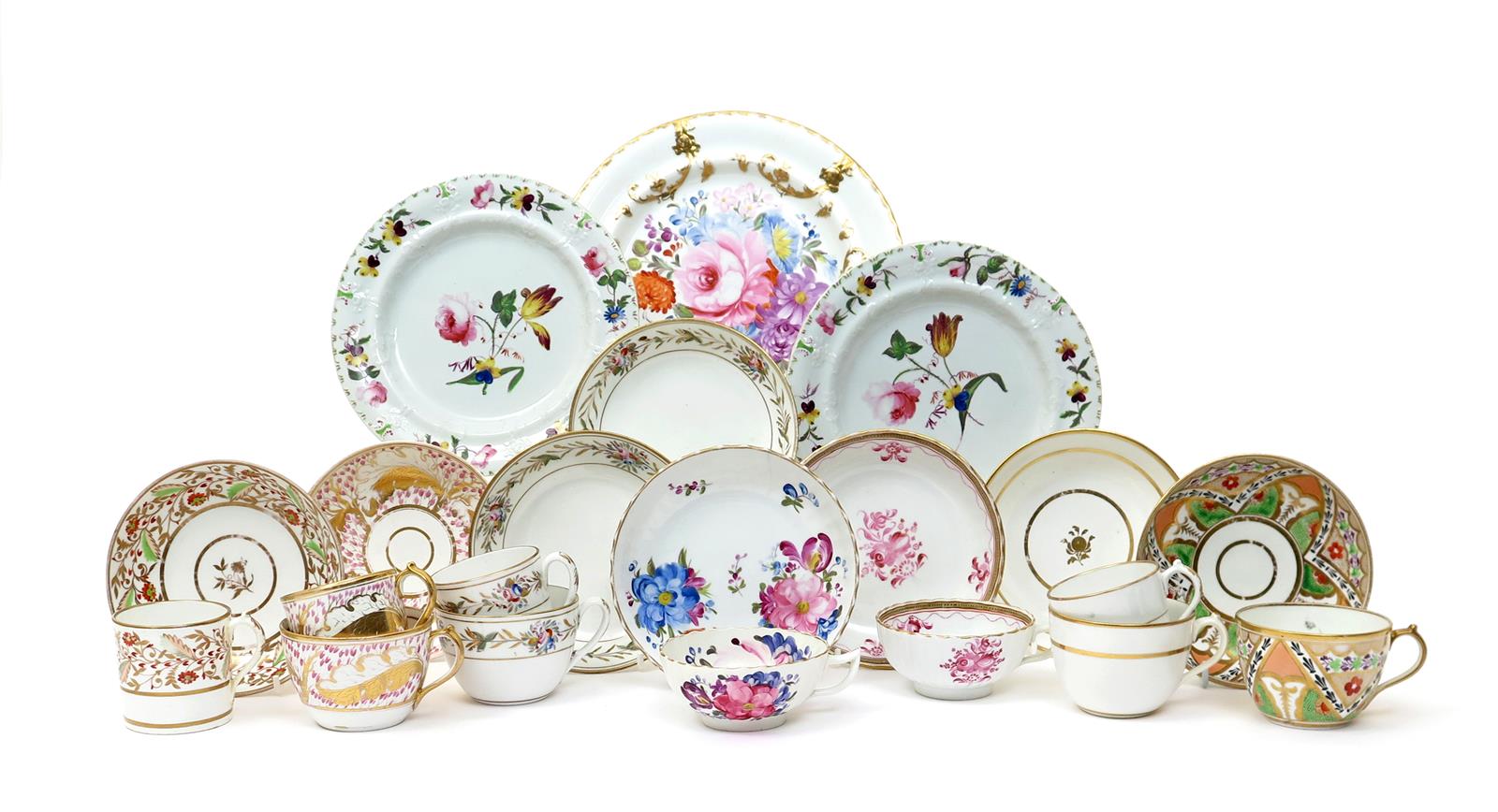 Three Miles Mason porcelain trios c.1800-05, a teacup and saucer, a coffee can and saucer and another saucer, all variously decorated with stylized floral and foliate borders, two Charles Mason fluted cups and saucer with floral decoration, a Charles Mason moulded plate painted with a bold spray of flowers, and a pair of Mason's Ironstone dessert plates with moulded rims, painted with tulip, rose and heartsease, 23.8cm max. (21)