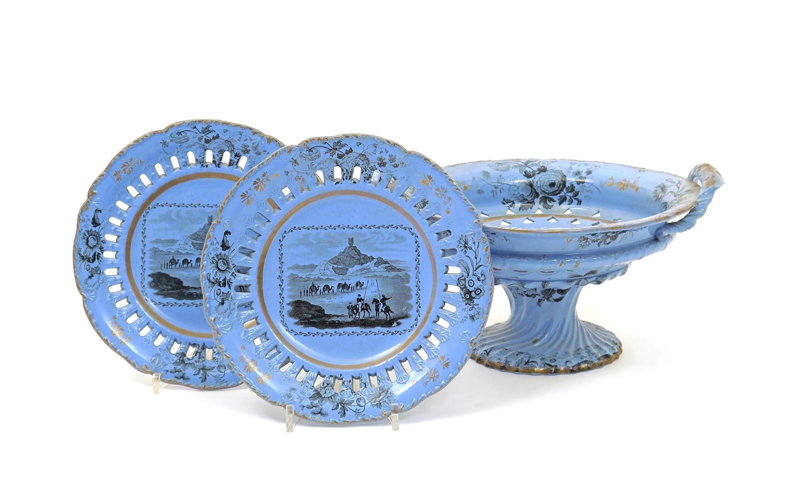 A James Keeling comport and two plates c.1830, printed in black with views of Birs Nimroud from Buckingham's 'Travels in Mesopotamia', reserved on a blue ground with floral sprays to the pierced rims, 29cm max. (3)
