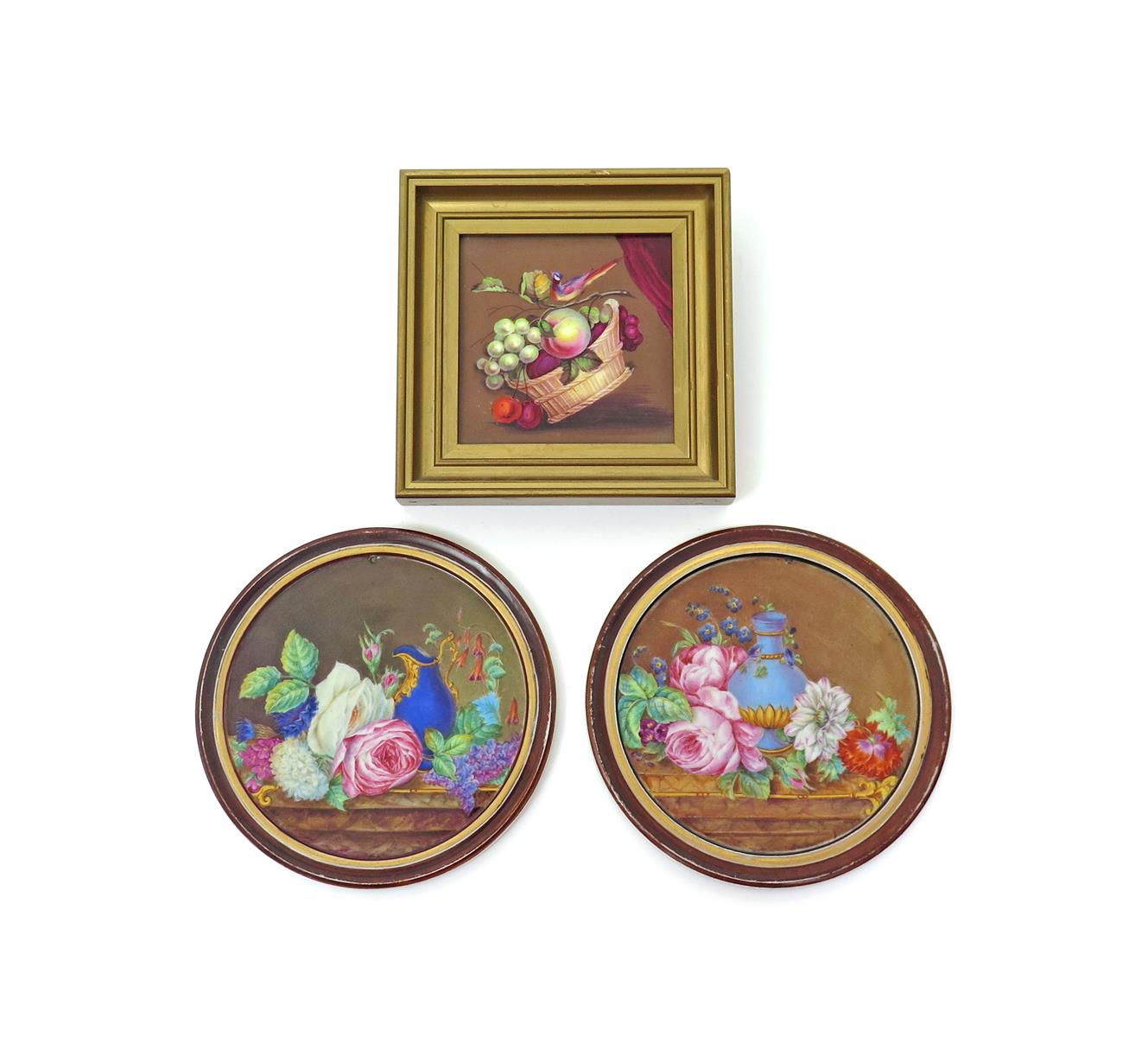 A pair of porcelain circular plaques 19th century, painted with ewers amidst large rose, lilac and dahlia flowers, resting on decorative table tops, and an English porcelain square plaque painted with a colourful bird alighted on a fruiting branch on a tilted basket filled with grapes and other fruits, in a later giltwood frame, 13.3cm max. (3)