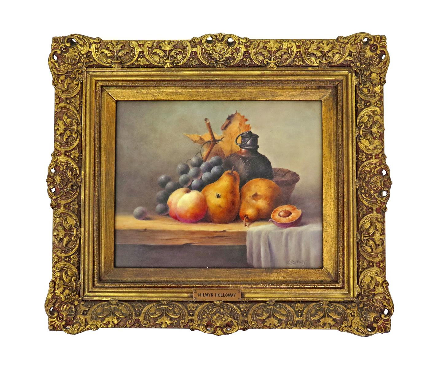 A Milwyn Holloway porcelain plaque modern, painted with an arrangement of fruit on a wooden table, a small fly alighted on a pear, a cut peach resting on the edge of a white linen tablecloth, signed, within a titled gilt wood frame, the plaque 20cm x 24.5cm.