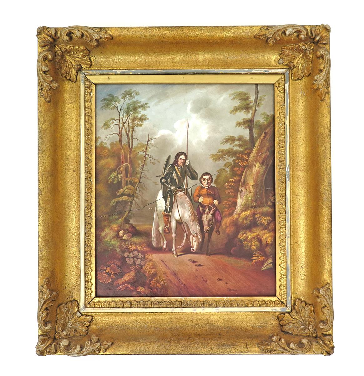 An English porcelain rectangular plaque mid 19th century, attributed to John Wager Brameld at Rockingham, painted with a scene from Cervantes' novel, with Don Quixote and Sancho Panza on horseback between trees, in a gilt wood frame, broken and restuck, the plaque 33.5cm high.