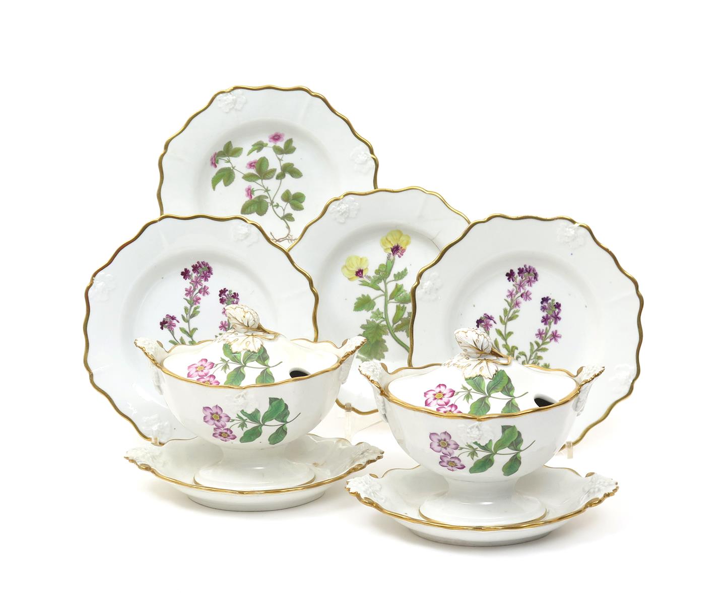 A Ridgway part dessert service c.1830, printed and coloured in pattern 805 with botanical specimens including Periwinkle, Golden Flowered Henbane and Alpine Erinus, titled in black to the underside, the prints taken from William Curtis's Botanical Magazine. Comprising: two sauce tureens with covers, and four plates. (8)