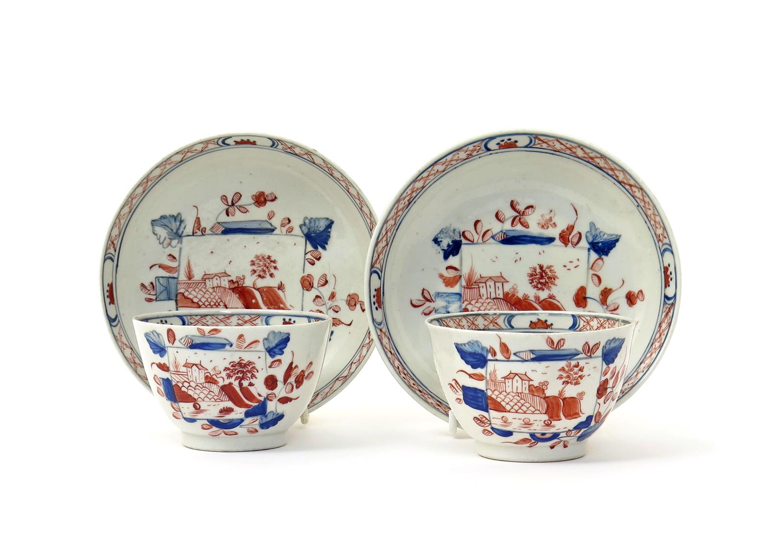 Two porcelain teabowls and saucers c.1800, attributed to Factory Y, painted in the Imari palette with Swansea's House on the Lake pattern after Thomas Pardoe, the borders with semi flowerhead mon between hatched diaper bands, 13.4cm. (4)