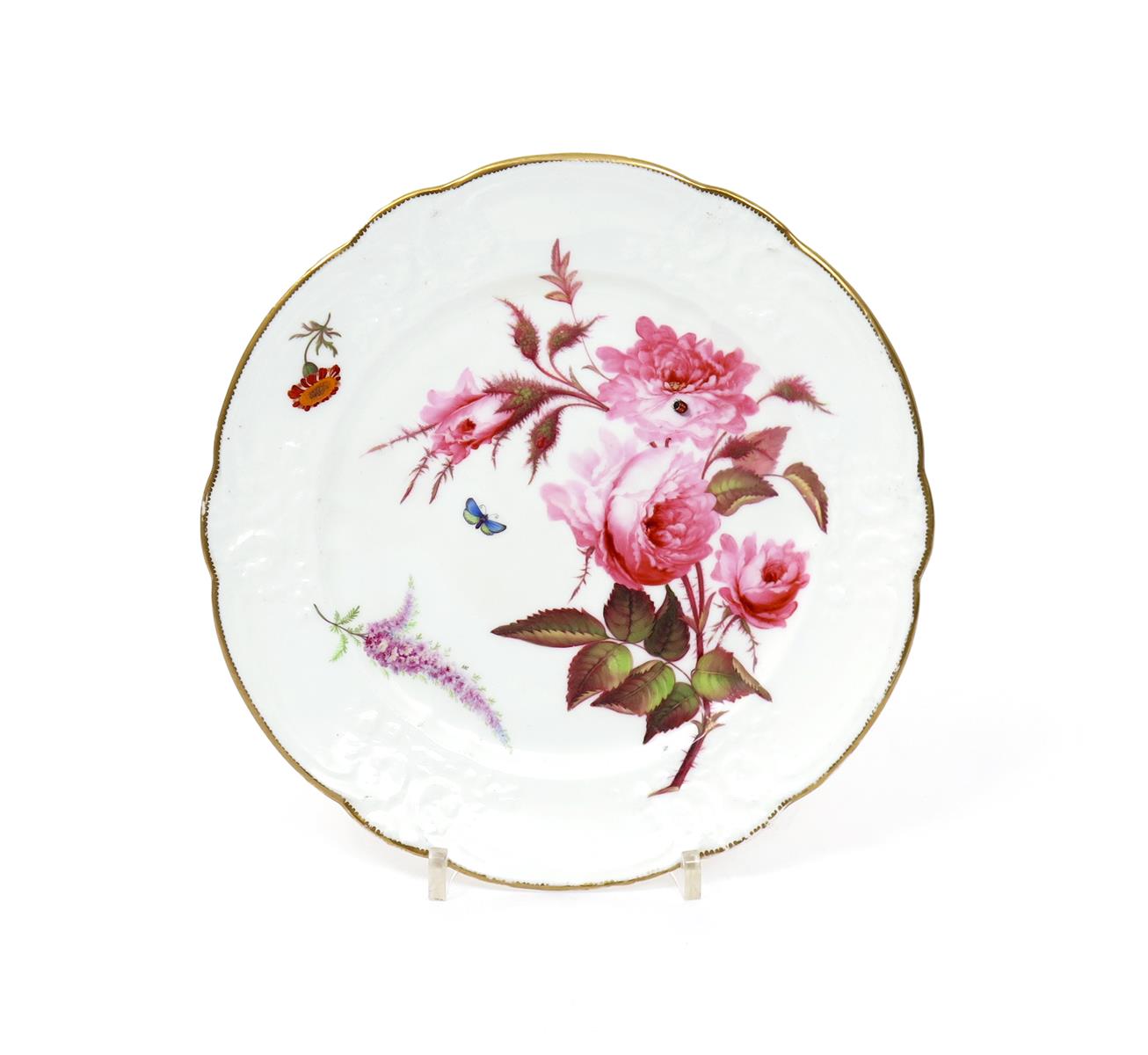 A Nantgarw plate c.1815-17, London-decorated with a large botanical spray of pink rose, a smaller lilac spray and a single small blue butterfly, the rim moulded with C scroll panels within a gilt dentil rim, impressed mark, 21.5cm.