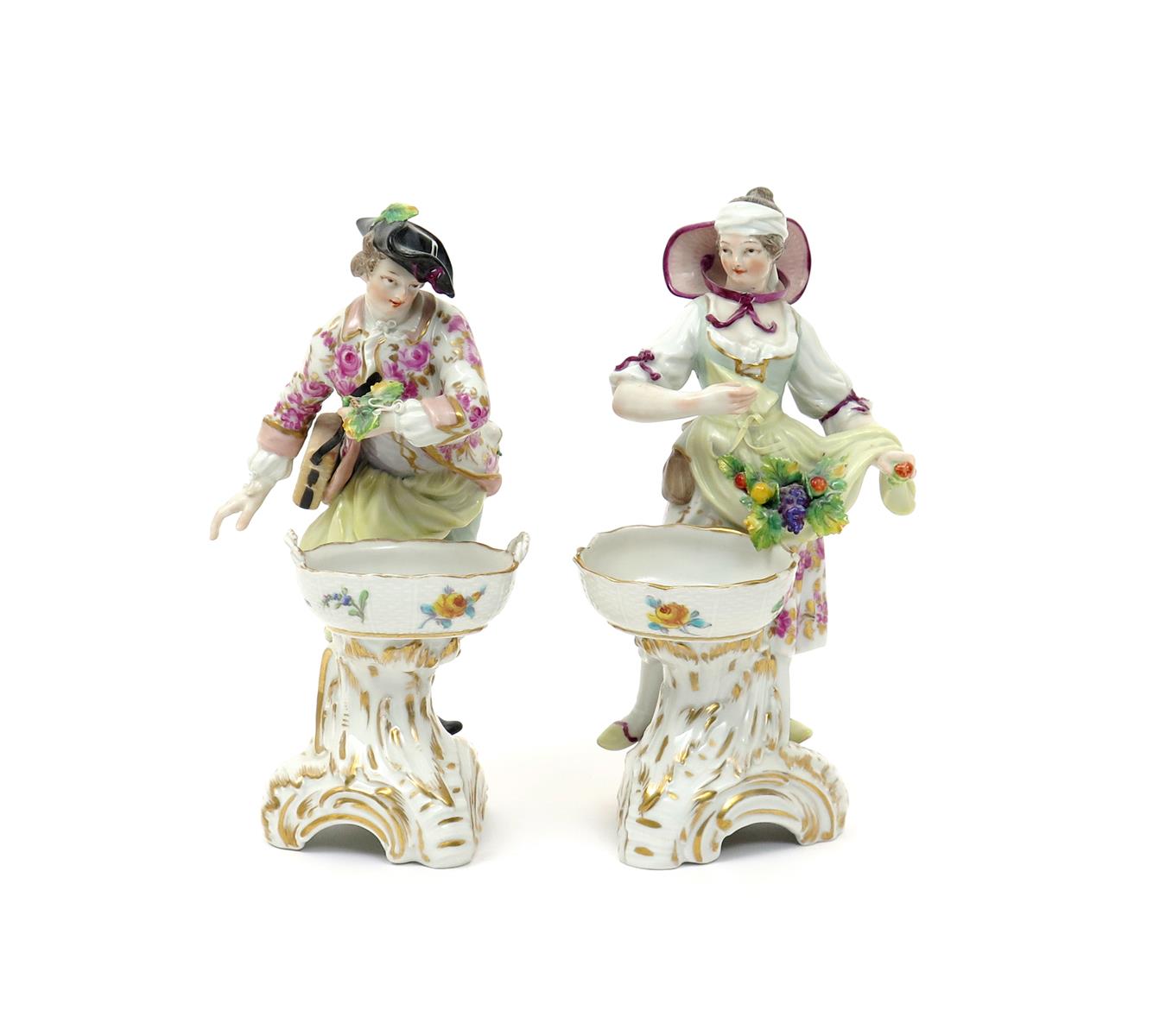 A pair of Berlin sweetmeat figures 19th century, modelled as a lady and her companion each holding grapevine and other fruits and flowers, standing before an oval basket painted with flowers and raised on a triangular scrolled base, blue sceptre marks, some damages, 22.2cm. (2)