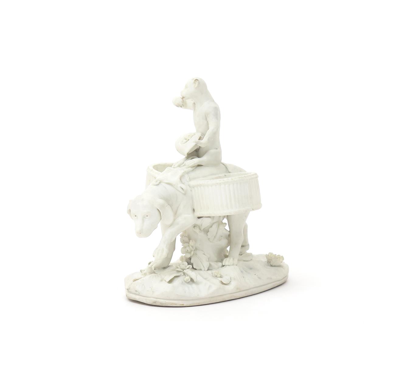 A French biscuit porcelain sweetmeat figure late 18th century, modelled as a monkey riding on the back of a large dog with empty panniers strapped to his back, the monkey eating fruit from an upturned hat, raised on an oval base applied with flowers, 12cm high.