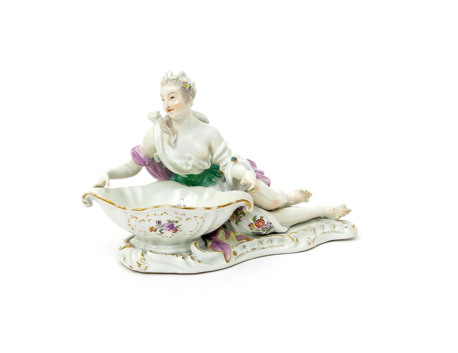 A Meissen sweetmeat figure 2nd half 18th century, modelled as a scantily clad recumbent maiden holding the sides of a large basket and raised on a shaped, flat base, blue crossed swords mark, some faults, 18.5cm.