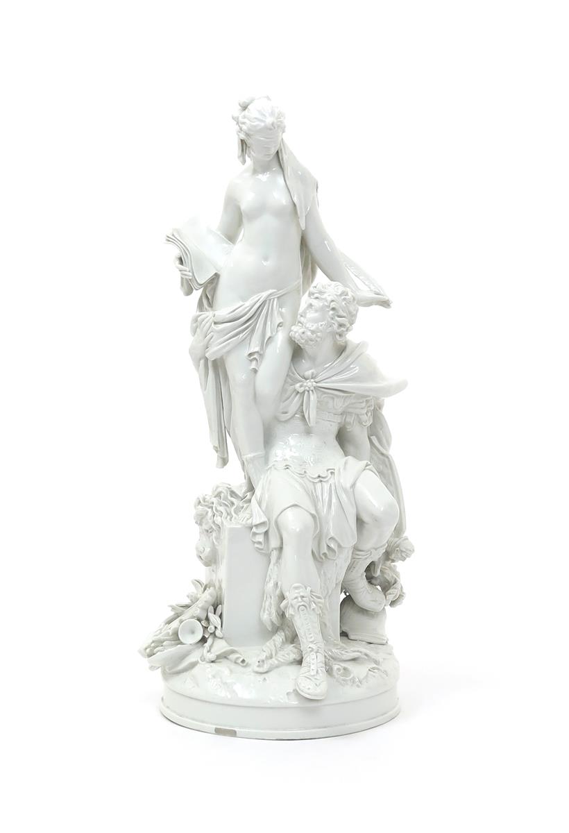 A large Berlin figure group of Mars and History late 18th/early 19th century, modelled by W C Meyer, Mars seated on a square block draped with a lion skin, holding his shield behind him, History standing above him holding a book and feather quill, Mars with his right arm around her hips, left in the white, raised on a circular base, blue sceptre mark, 47cm.