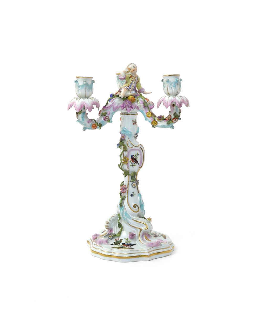 A Meissen three-branch candelabra 19th century, the scrolled stem painted with birds and applied with flowers, between the three branches a figure seated and holding an apple, blue crossed swords mark, 35cm.