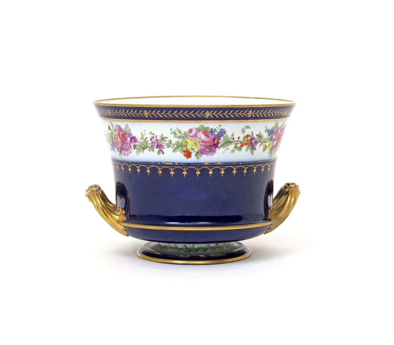 A large Sèvres-style two-handled jardinière 19th century, well painted with a continuous garland of flowers reserved on a dark blue ground, raised on a low circular foot, overglaze mark of 'Sevres y', two rim cracks, 18cm.