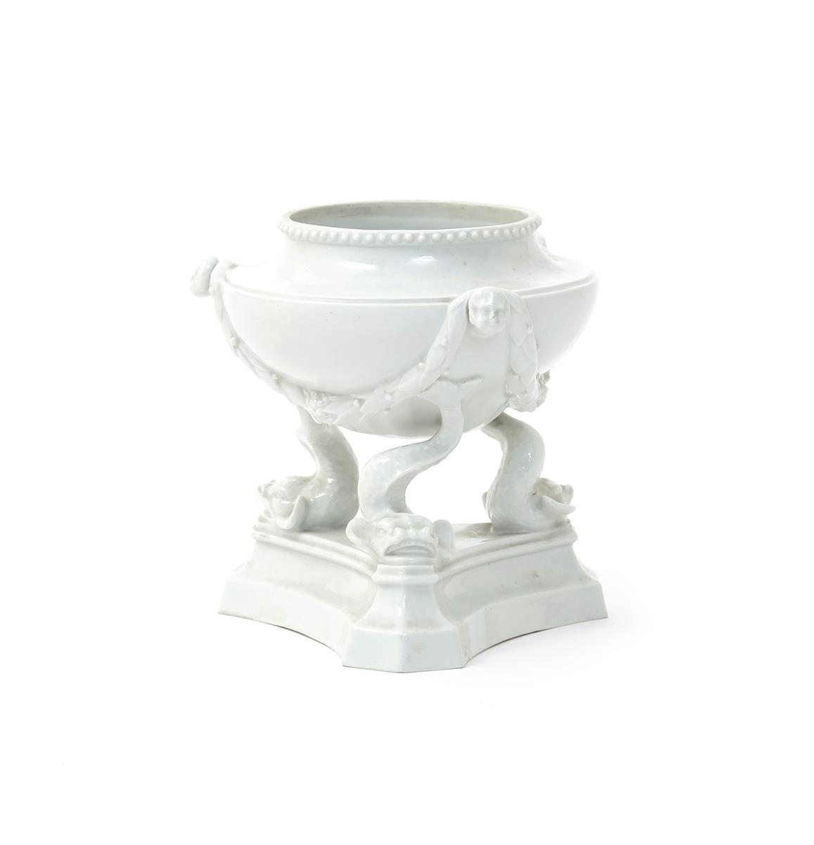 A Fürstenberg vase or pastille burner late 18th century, the rounded urn raised on the tails of three dolphins on a shaped triangular base, the shoulder applied with berried garlands supported by small masks, blue F mark, the cover lacking, 14.5cm.